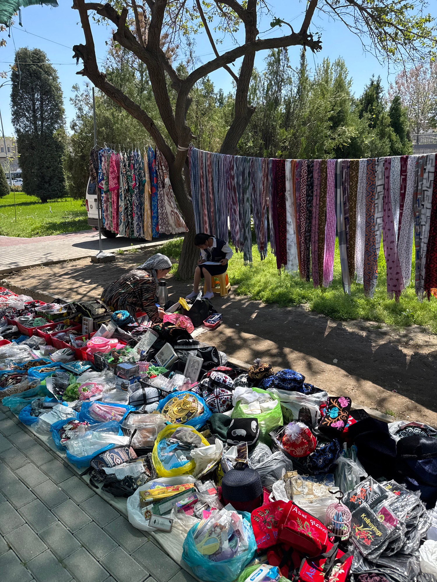 The image shows an outdoor market scene in Samarkand City, Uzbekistan. A vendor wearing a headscarf sits on the ground beside a large assortment of merchandise, primarily hats and textiles. These item…read more