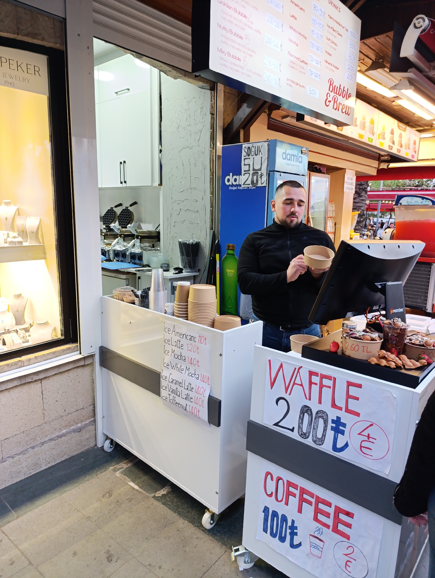 The image depicts a street-side food stall in Antalya, Turkey. A man stands behind the counter preparing a beverage. He wears a black jacket and jeans and holds a cardboard cup in his hands. Behind hi…read more