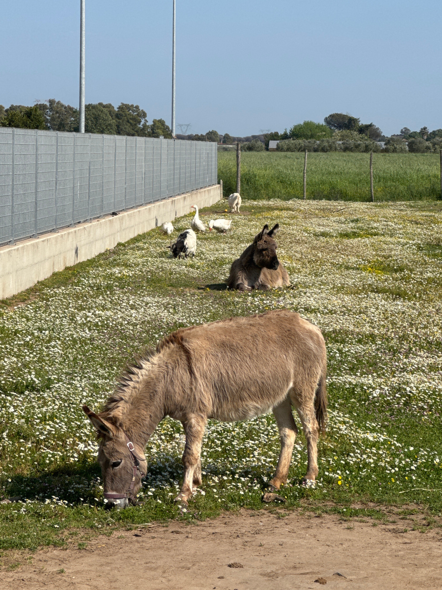 This outdoor scene, captured in Aprilia, Italy, depicts a tranquil rural setting under a clear, bright sky. The central subjects are two donkeys and several geese inhabiting a vibrant field. In the f…read more