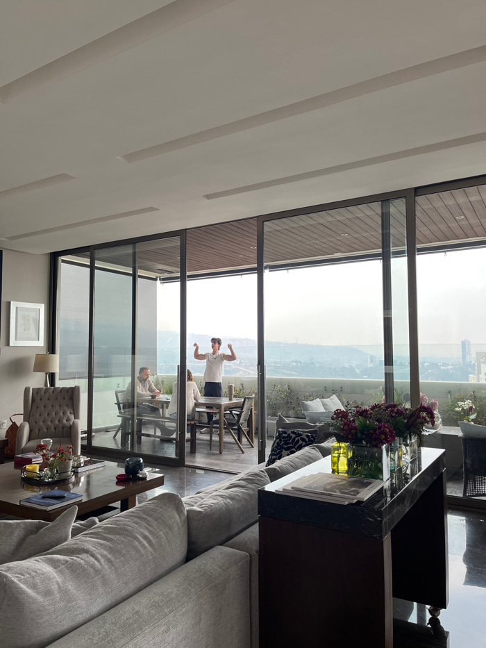 An elevated view from a modern apartment in Santiago Yancuitlalpan, Mexico, shows an interior living space opening onto an outdoor balcony. In the foreground, a light gray sectional sofa and a dark wo…read more