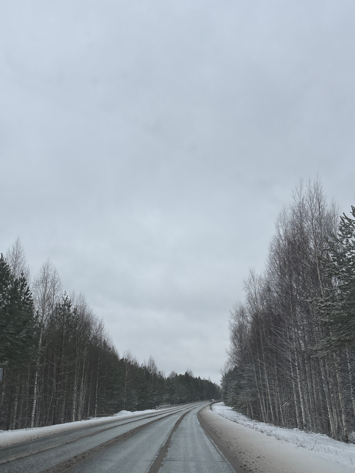 A view of a road leading through a forest in winter, with a gray overcast sky above. The road, slightly wet, runs off into the distance, with tire tracks visible on the surface. On either side of theβ¦read more