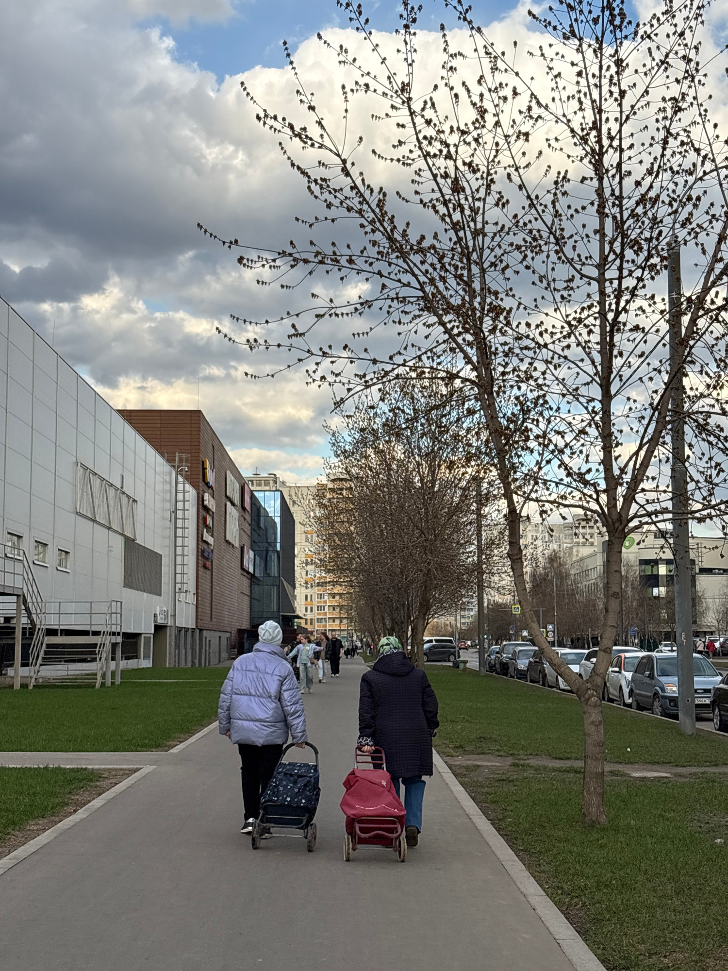 The image captures a street scene in Moscow, Russia, depicting two elderly women walking along a sidewalk. They are pulling wheeled shopping carts behind them. The sidewalk is adjacent to a grassy areβ¦read more