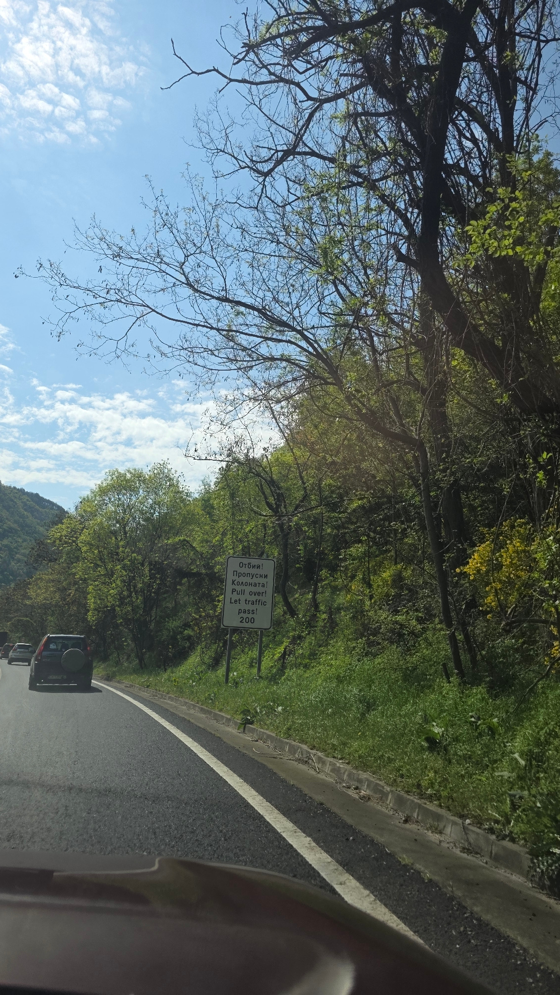 The image depicts a road in Stara Kresna, Bulgaria, lined with trees and vegetation. A road sign is visible, featuring text in both Bulgarian and English: "Pull over! Let traffic pass! 200". Several c…read more