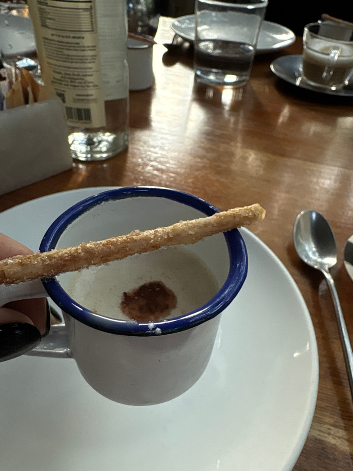 A white mug with a blue rim sits on a white saucer, holding a beige liquid with a dark swirl inside. A long, thin, cylindrical snack covered in granules is partially submerged in the liquid. A hand wi…read more