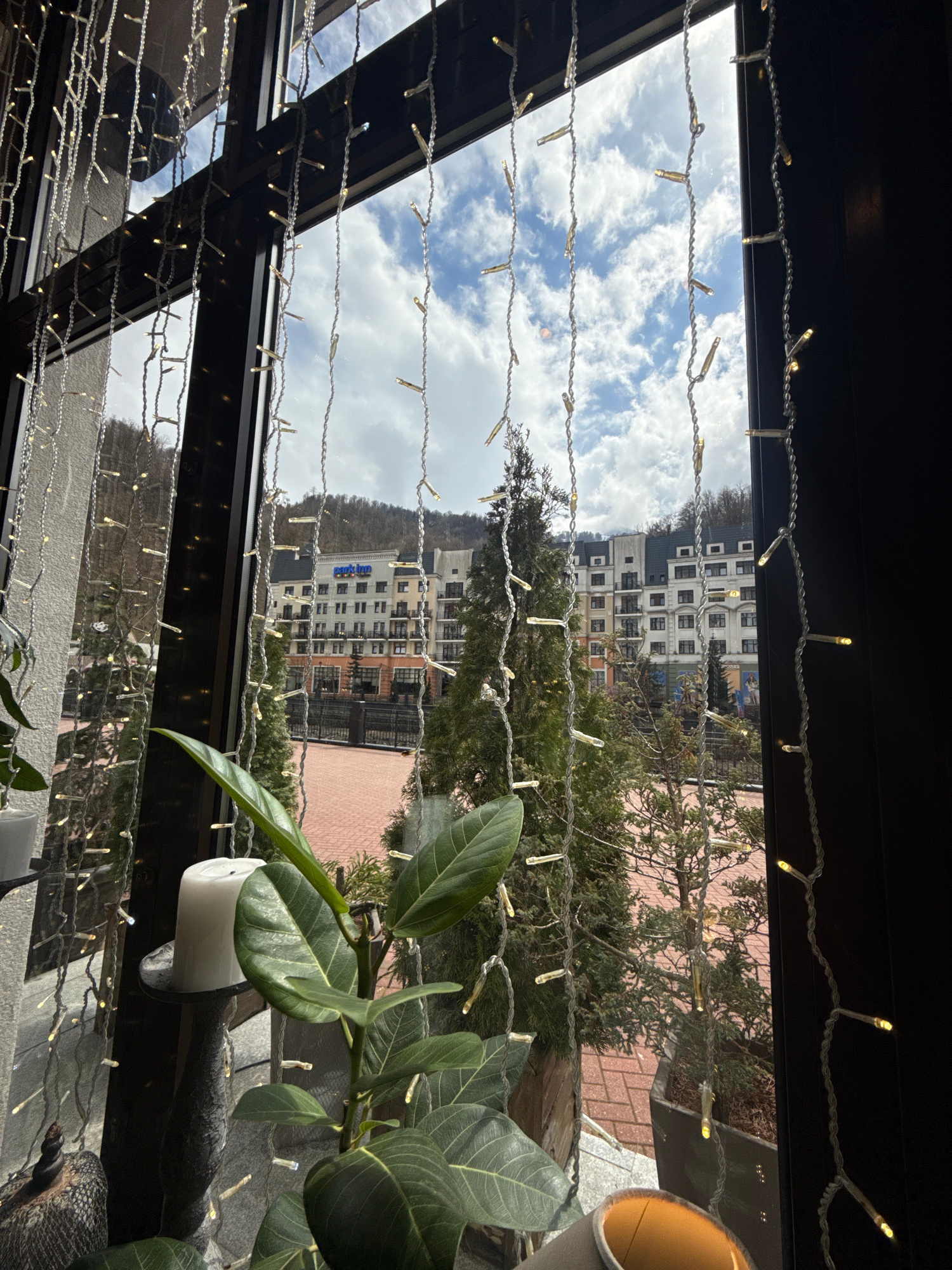 The image, taken from indoors, shows an exterior view framed by a window decorated with strands of small lights. The window view includes buildings, trees, and sky. A building, identified by signage a…read more