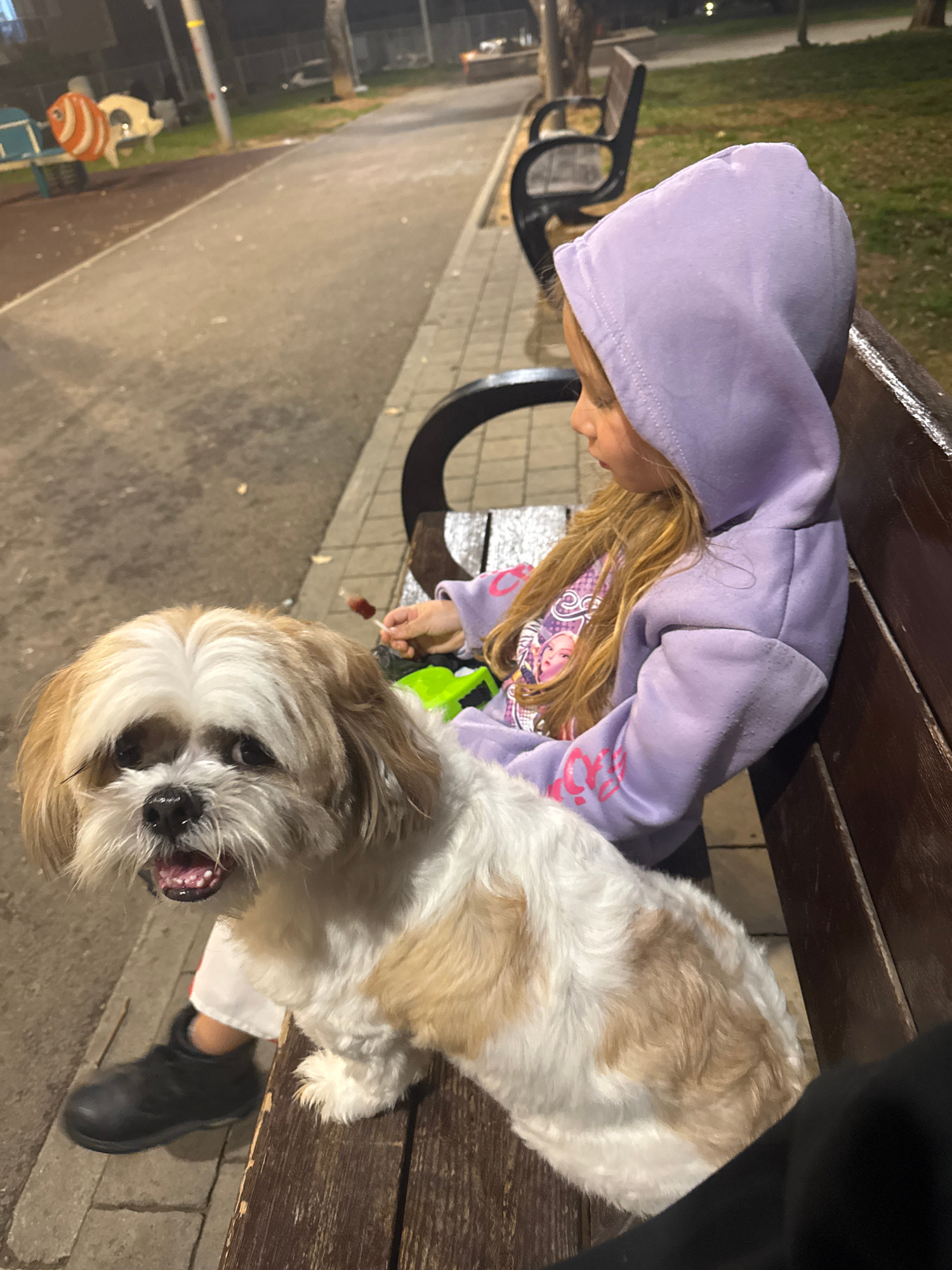 A girl in a purple hoodie sits on a park bench in Bat Yam, Israel, next to a Shih Tzu dog. The girl is holding a small object, possibly food, while the dog is looking up at the viewer with its mouth s…read more
