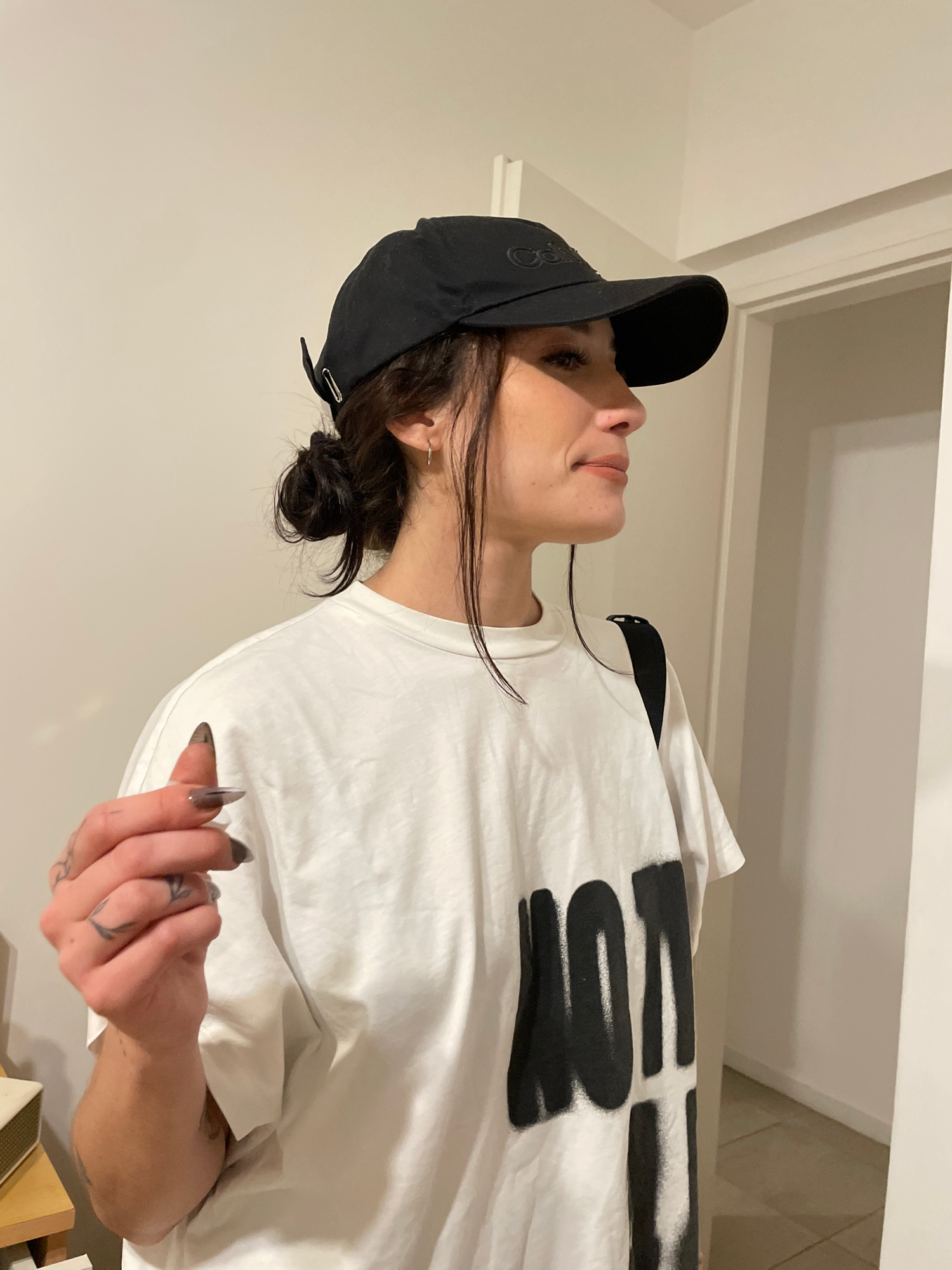 A woman wearing a black baseball cap and a white t-shirt with large black lettering stands indoors. The walls are light-colored, and there is a doorway in the background. The location appears to be in…read more