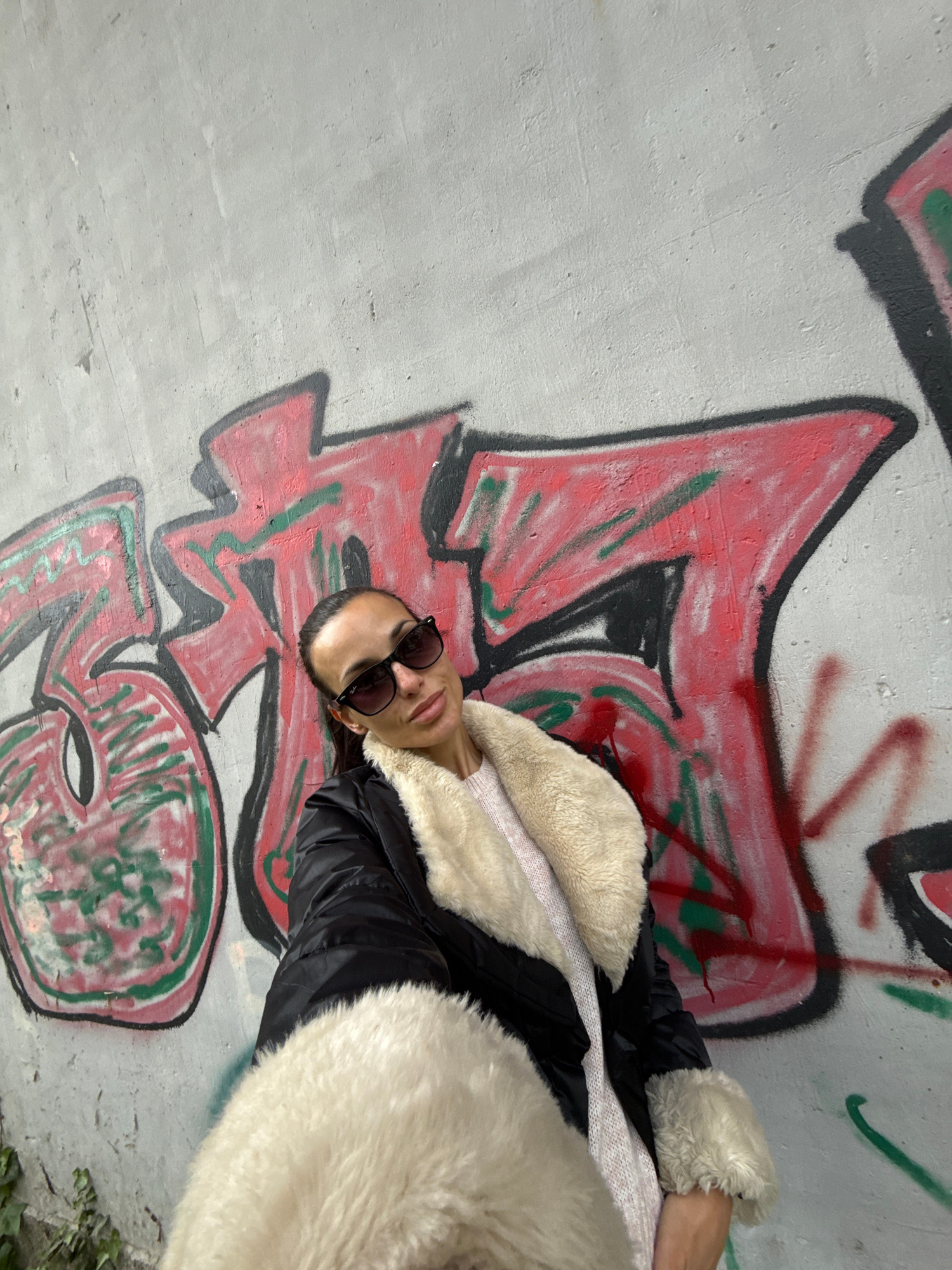 An individual, likely female, is depicted lying or leaning horizontally against a graffiti-covered concrete wall. She has dark hair pulled back and wears dark sunglasses pushed up onto her head. She i…read more