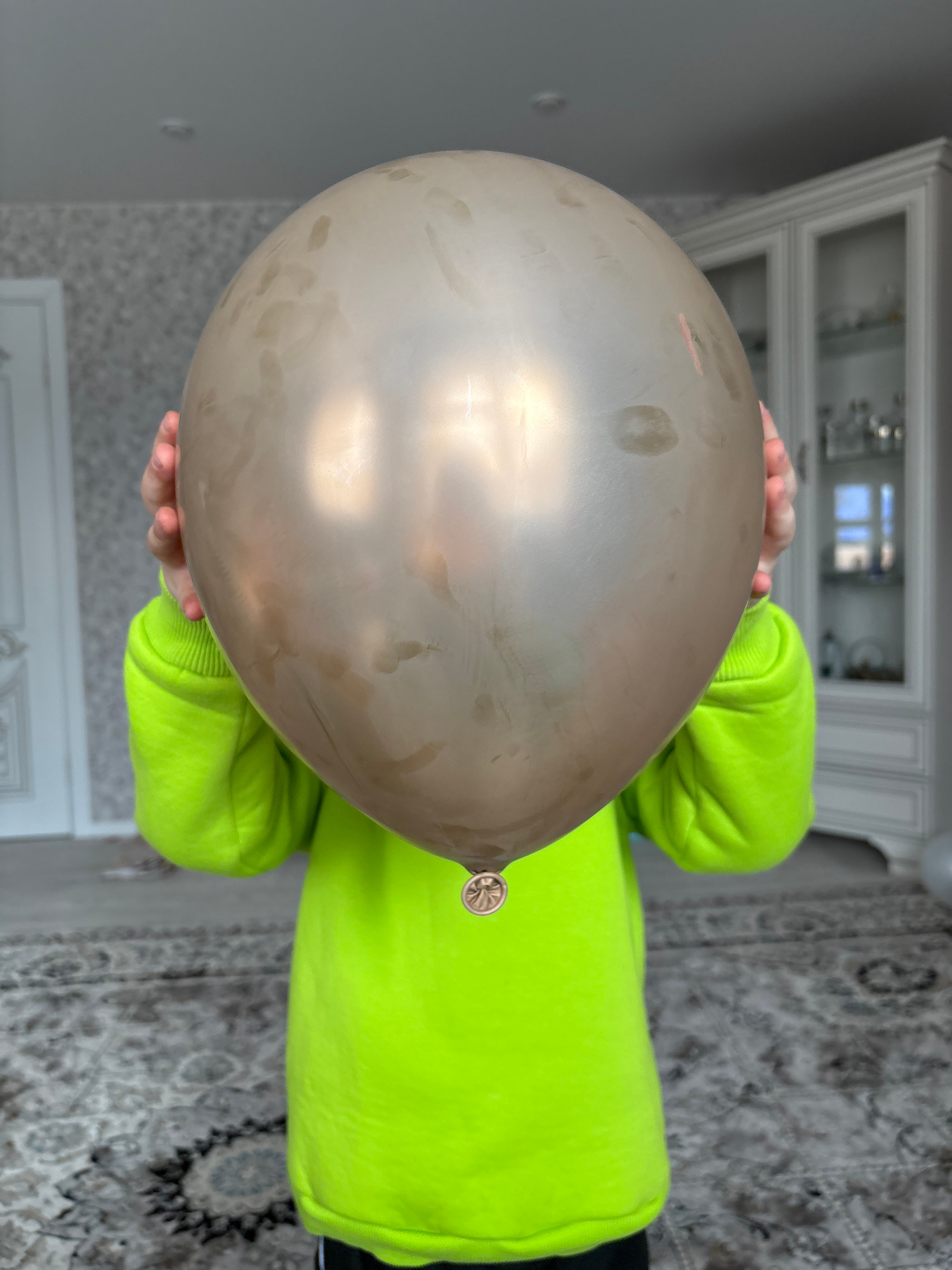 A child wearing a neon green sweatshirt is holding a dirty brown balloon in front of their face. The background is a room with patterned wallpaper, a white cabinet, and a patterned rug. There is a doo…read more