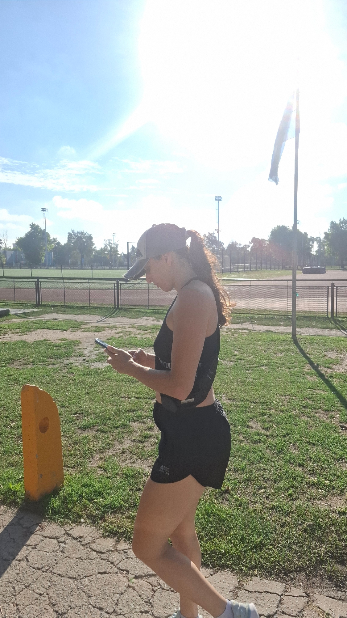 A medium outdoor shot shows a woman in athletic wear using a cellphone near a park path in Villa Domínico, Argentina. The woman is wearing black athletic shorts, a black top, a baseball cap, and white…read more