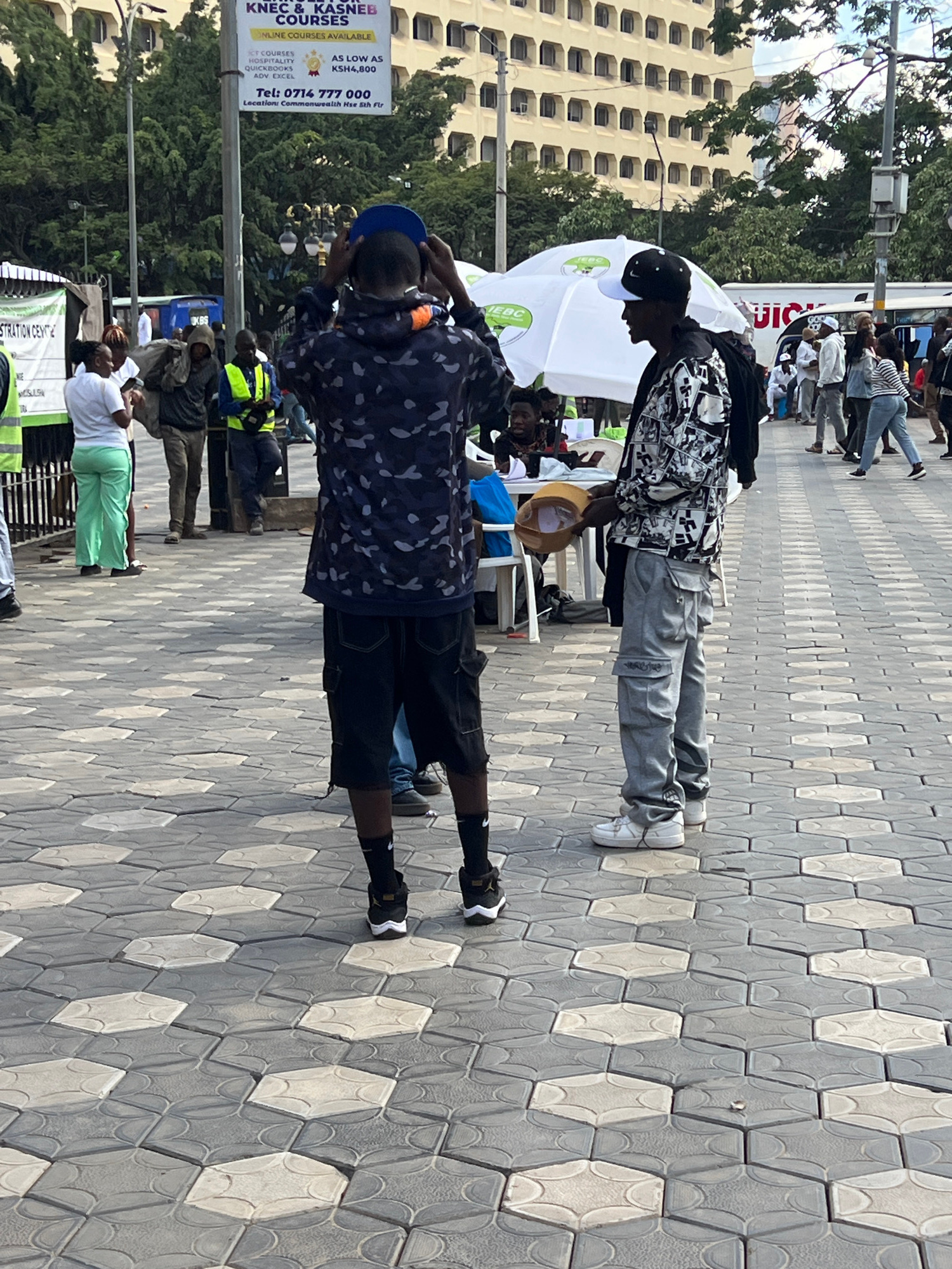 The image shows two young men standing on a sidewalk paved with a distinctive geometric pattern of gray and white hexagonal tiles. The man closest to the camera is wearing a blue baseball cap, a dark…read more