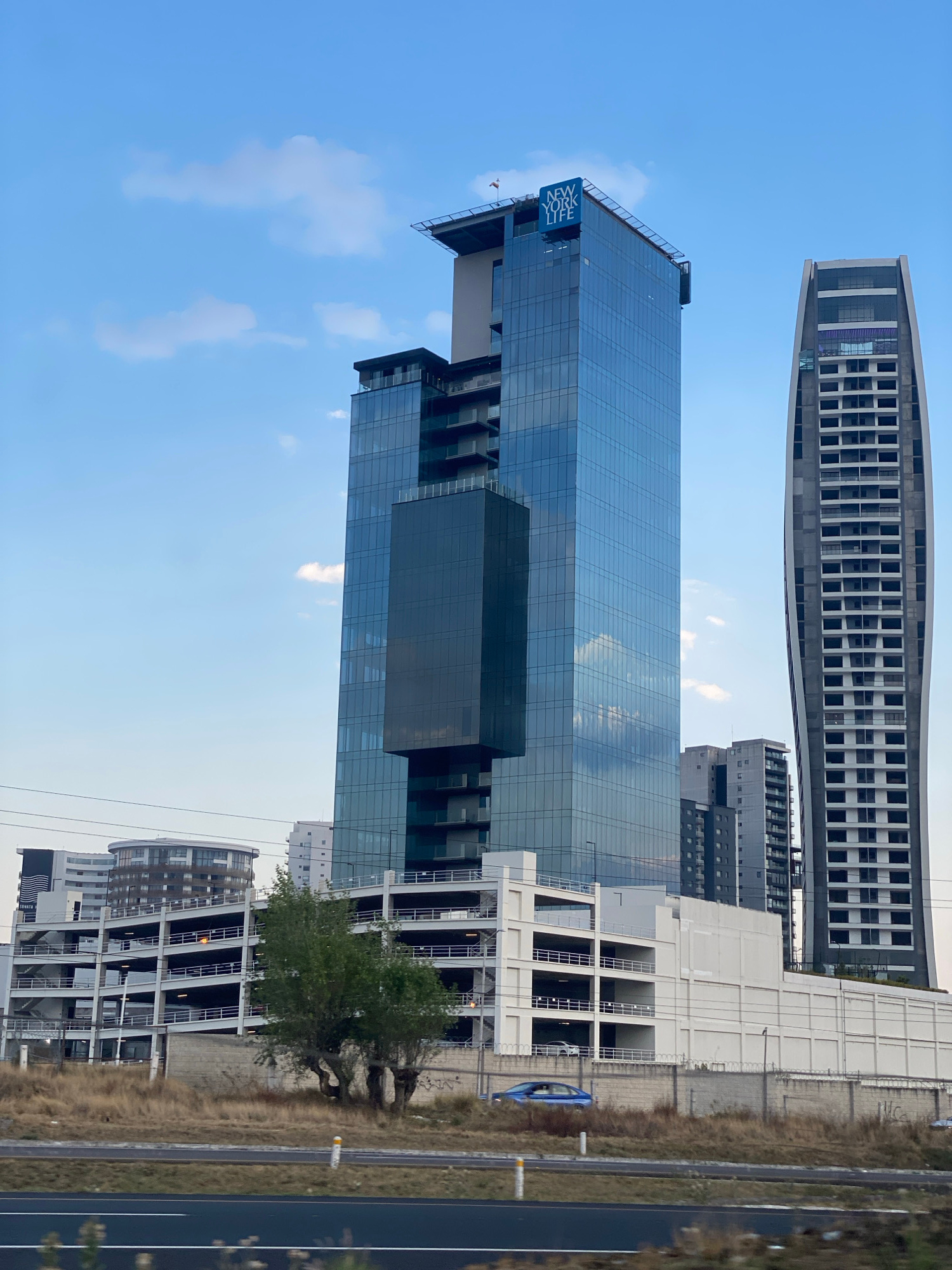 The image shows a view in San Bernardino Tlaxcalancingo, Mexico, featuring several modern buildings under a blue sky with scattered clouds. Prominently displayed is a tall, reflective glass building w…read more