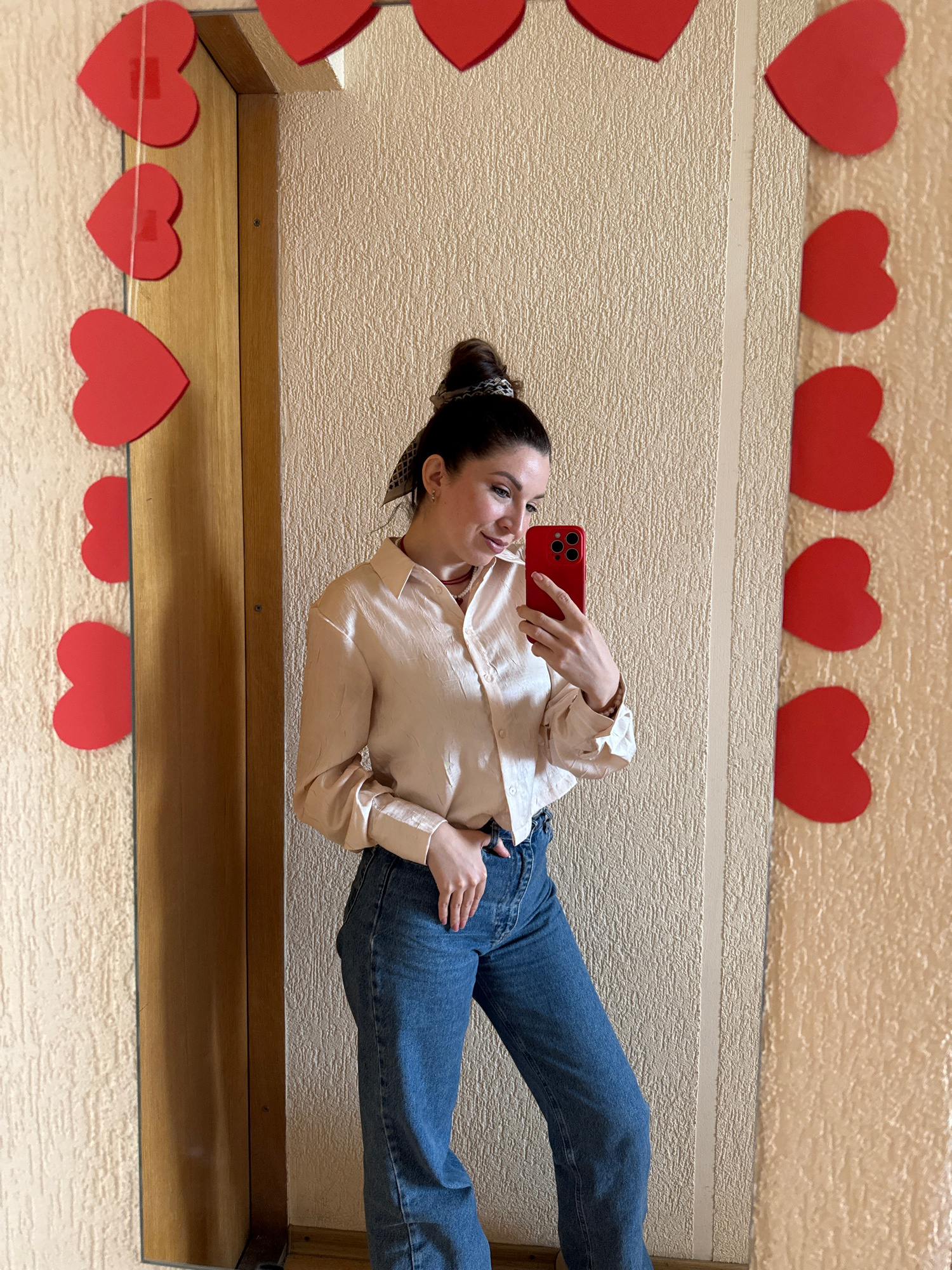 This image captures a young woman taking a mirror selfie in an indoor setting, likely in Kryvyi Rih, Ukraine. The woman, appearing to be in her 20s or early 30s, is smiling and looking towards the red…read more