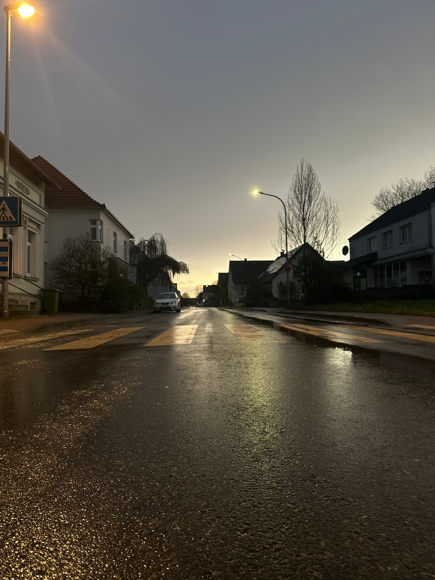 The photograph depicts a wet street scene in Melle, Germany. The perspective is low, tilted, and captures a straight, narrow road lined with buildings and trees, characteristic of a residential neighb…read more