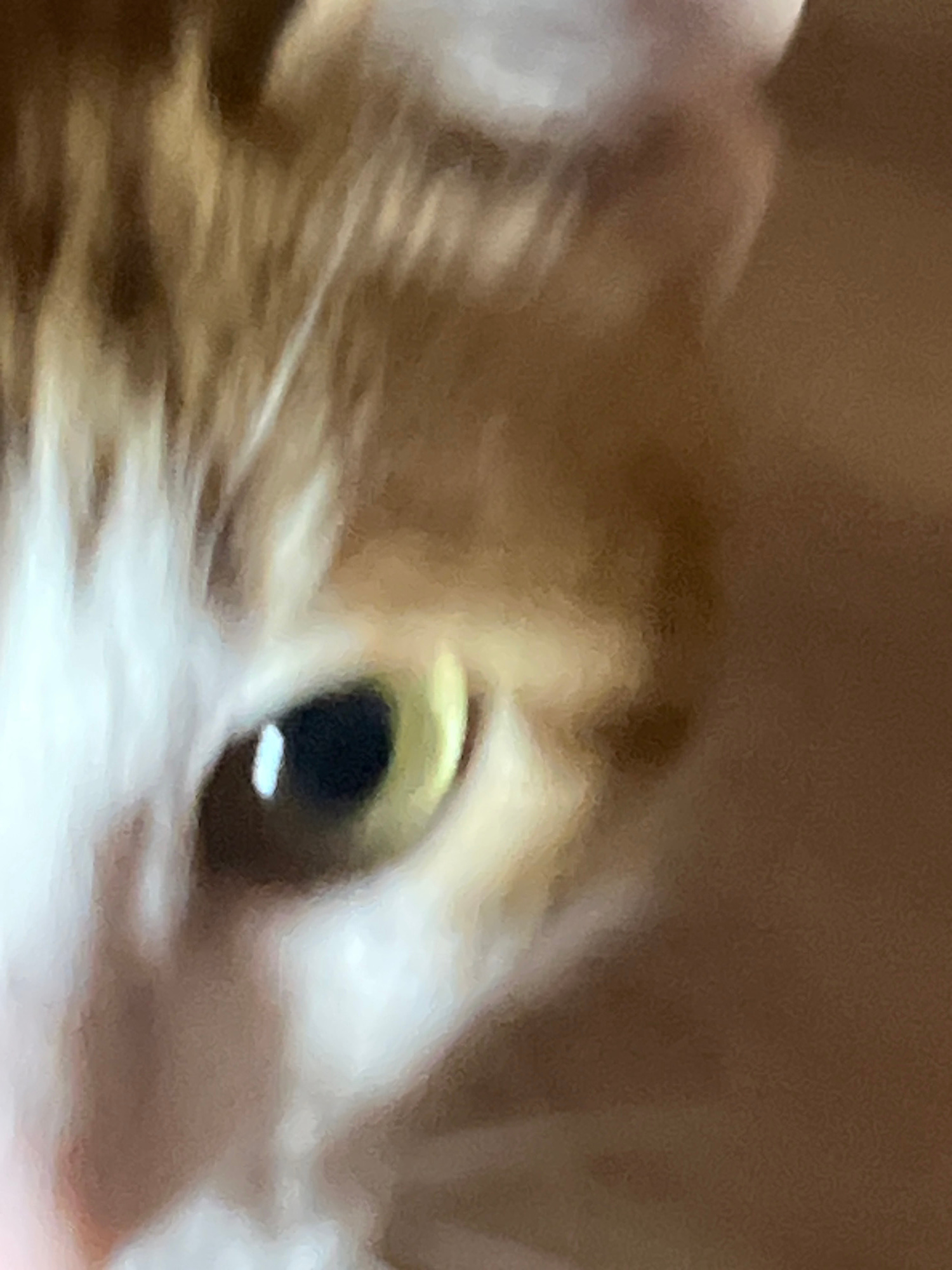 The image is a close-up of an orange cat's eye. The eye is yellow-green with a black pupil and a white highlight. The fur around the eye is a mix of orange and white. The background is blurry and out…read more