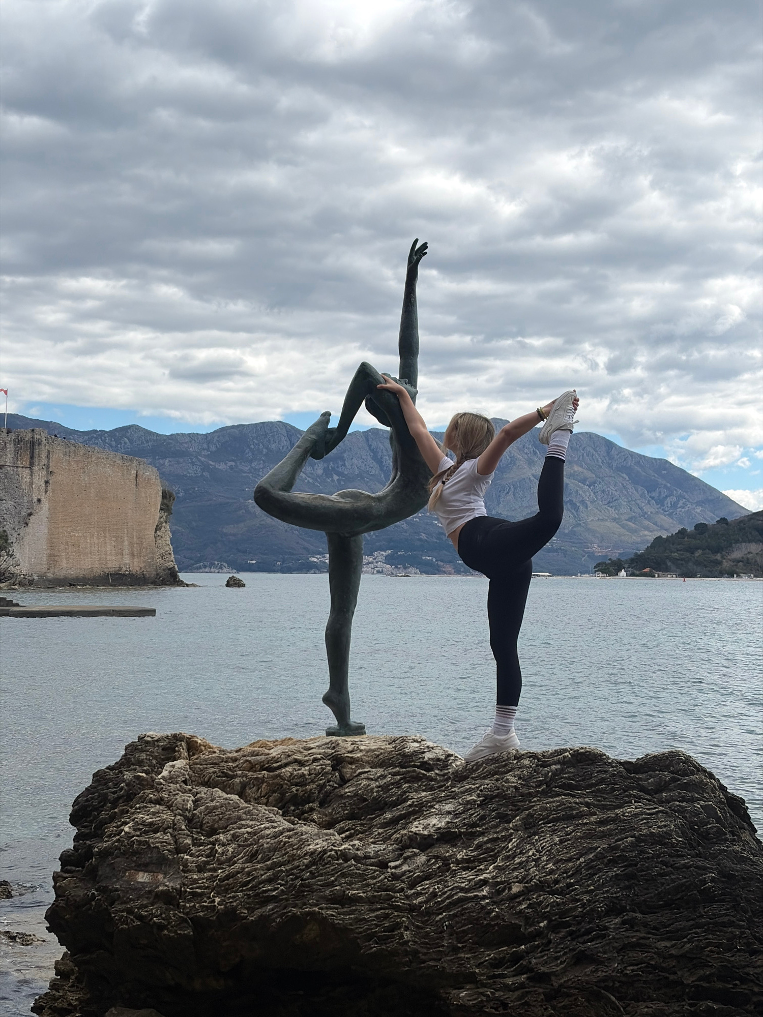 A rotated wide shot shows a young woman in a yoga pose atop a seaside rock formation, interacting with a metal sculpture, with a mountainous background and ocean in the city of Budva, Montenegro. The…read more