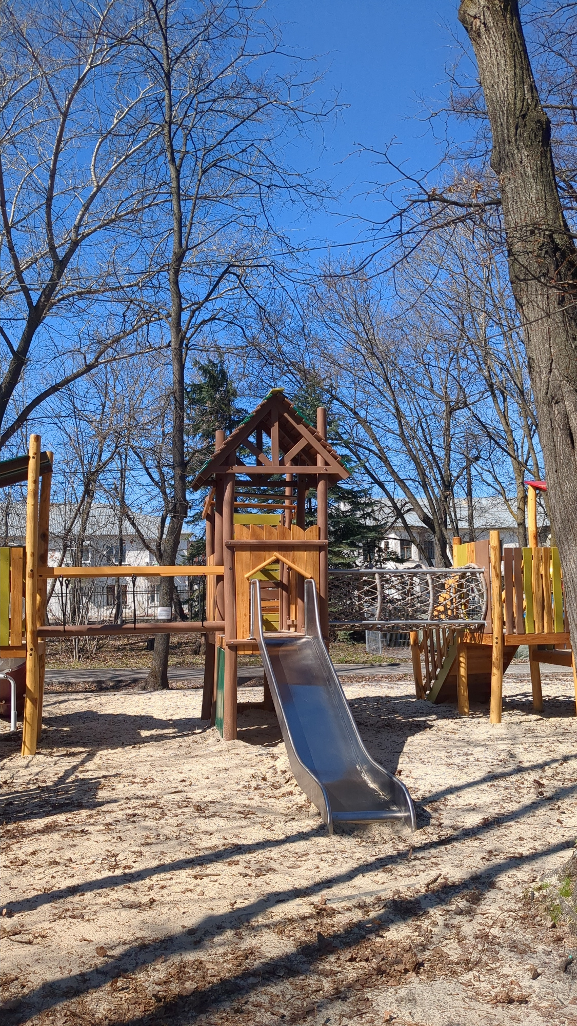 The image shows a children's playground in Ulyanovsk, Russia. The playground equipment is made of wood and metal, including a slide, a climbing structure with a net, and a multi-level playhouse-like s…read more