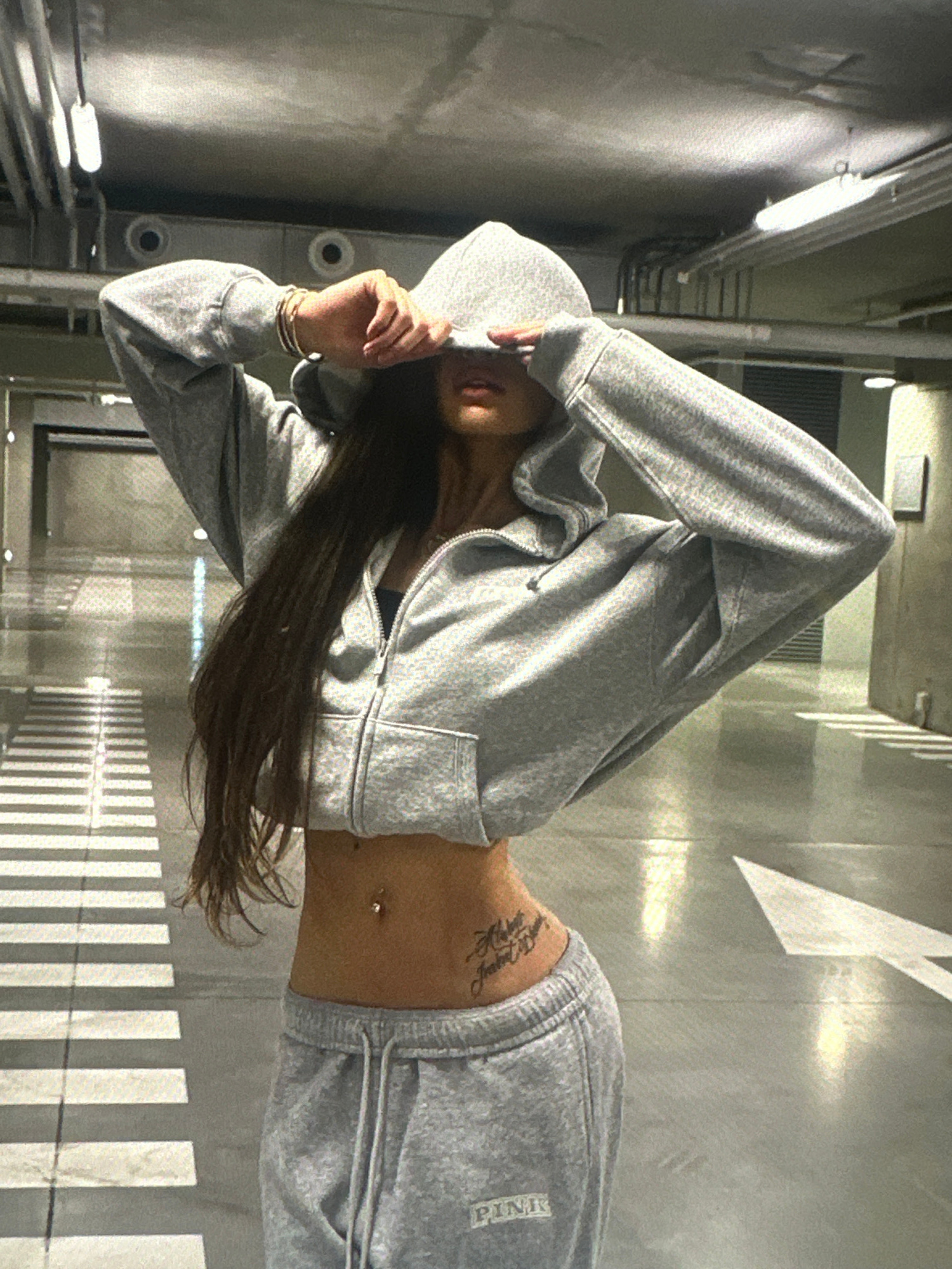 A person, lying on their side with their back facing up, is indoors. They are wearing a gray hoodie and sweatpants. The sweatpants have the word "PINK" written on them. The person has long brown hair…read more