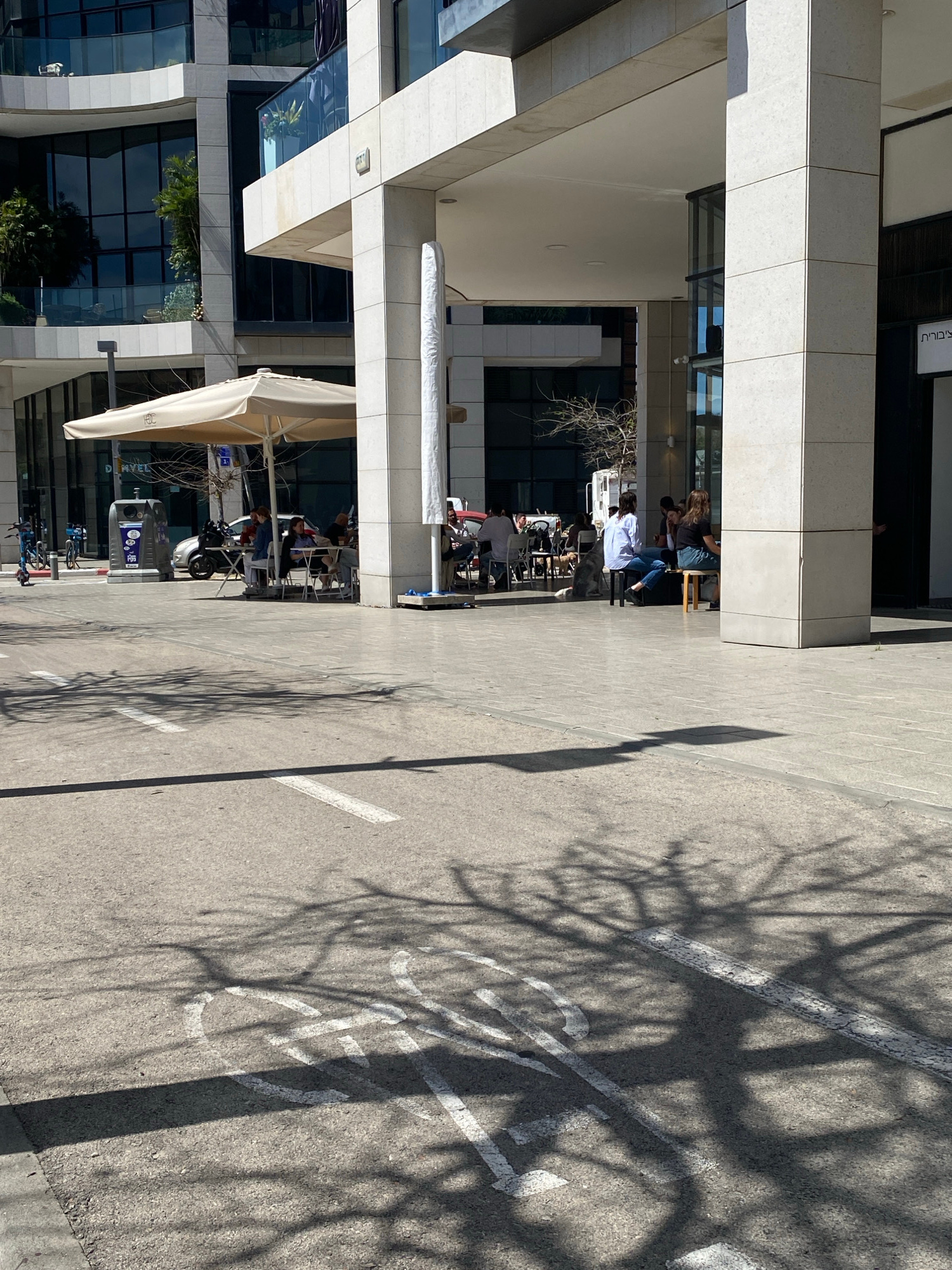 This image depicts a sunny urban street scene in Tel Aviv, Israel, likely near the Ha-Arba'a Street / Sarona Complex area, identifiable by the modern architecture and the visible "צ'ימברית" (Tz'imberi…read more