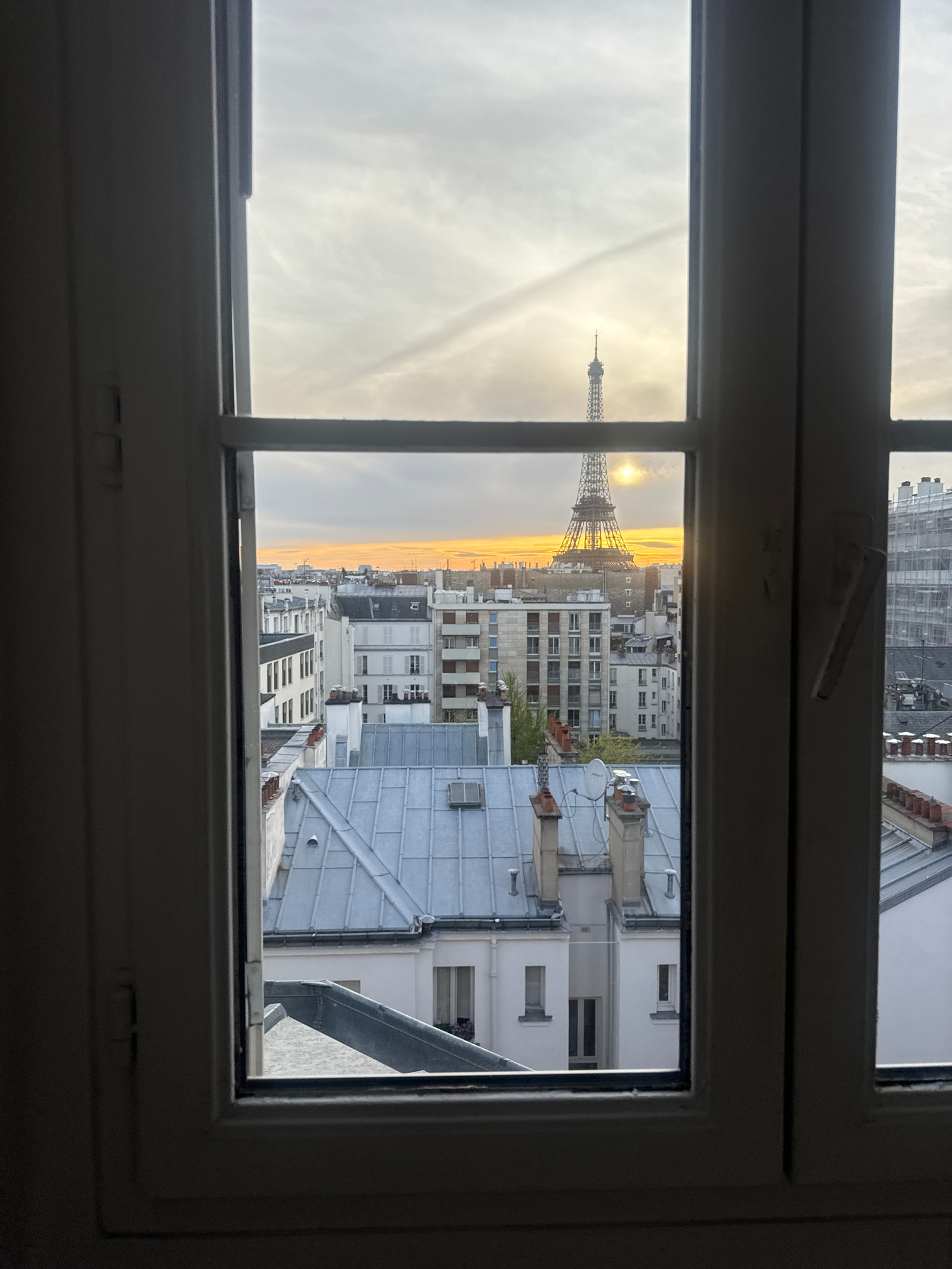 The image depicts a view of the Eiffel Tower through a window in Paris, France. The tower is visible in the distance, framed by the window panes, with the rising sun peeking from behind it. Other Pari…read more