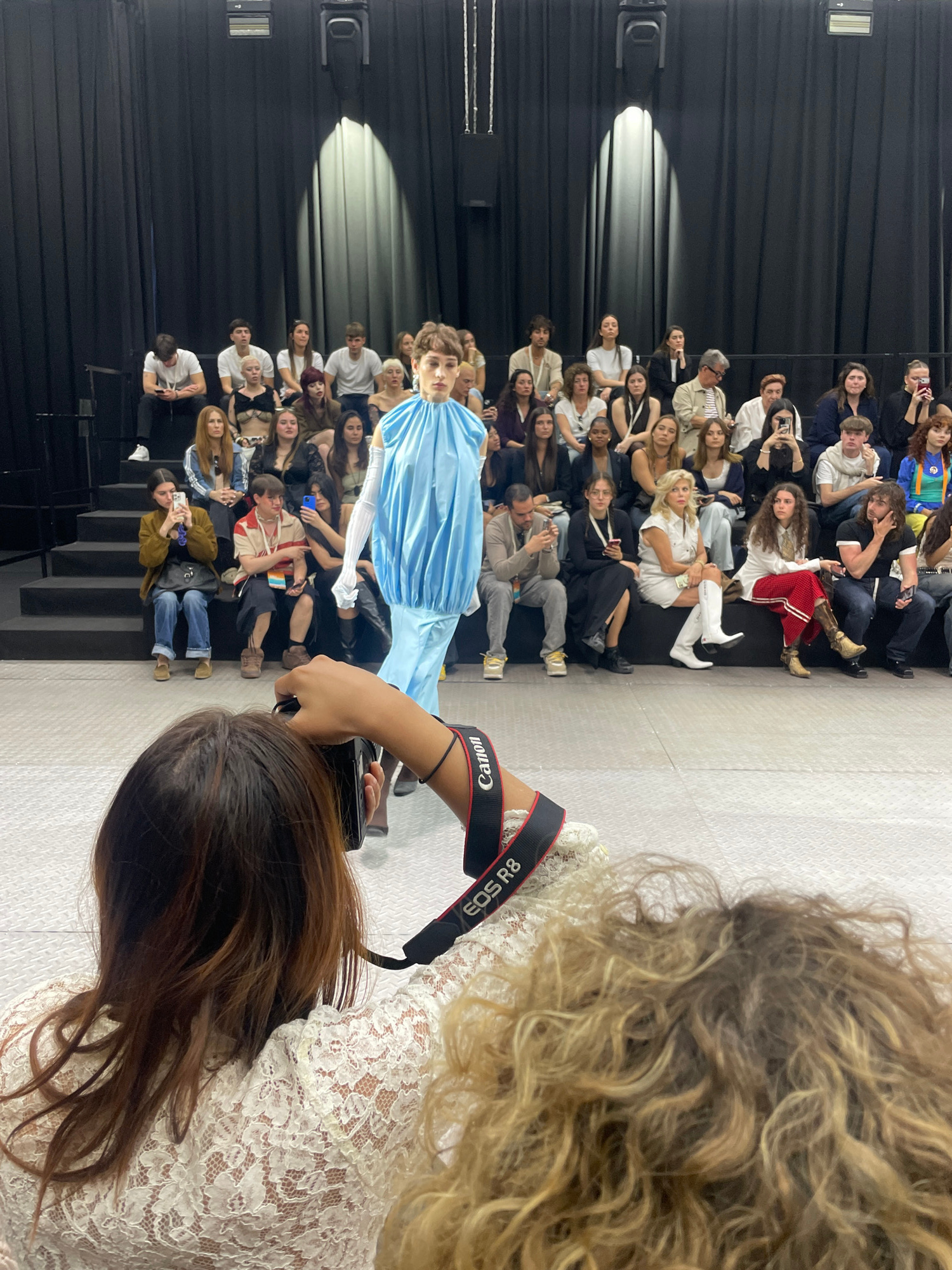 The image depicts an indoor fashion show or runway event, seen from an elevated perspective in the audience. In the foreground, the back of two individuals is visible: one with light brown, straight h…read more
