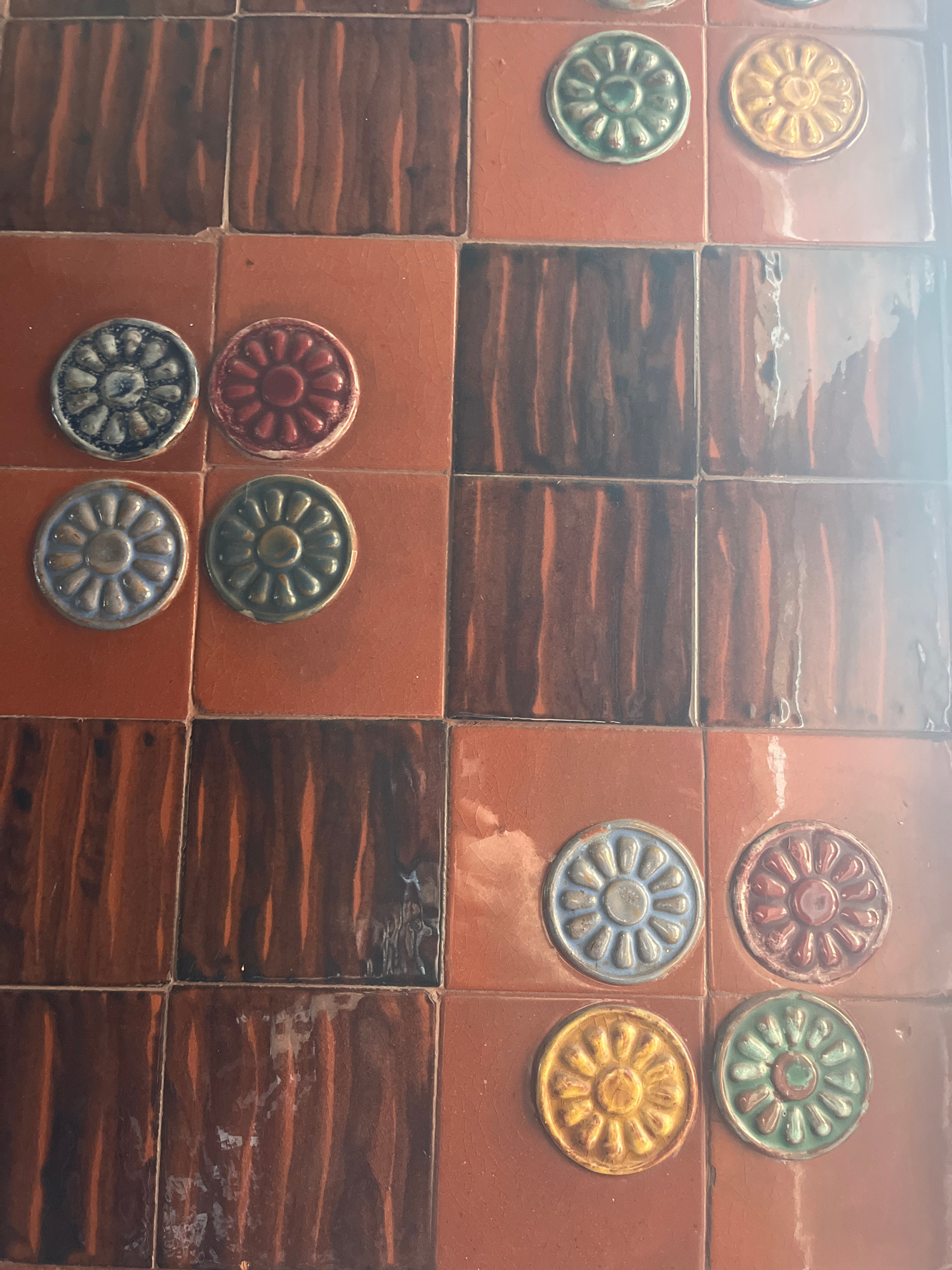 The image shows a wall covered in square ceramic tiles. The tiles are arranged in a checkerboard pattern using two colors: a solid orange-brown and a horizontally streaked brown. In some of the solidβ¦read more