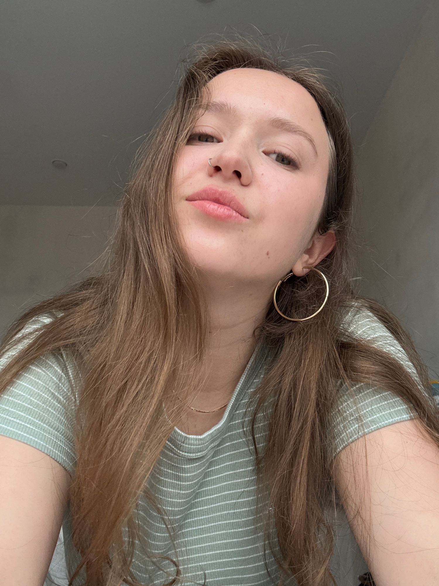 A young woman is pictured in a close-up selfie. She has long, light brown hair, fair skin, and wears a gold hoop earring and a nose ring. She is wearing a light green and white striped shirt. The back…read more