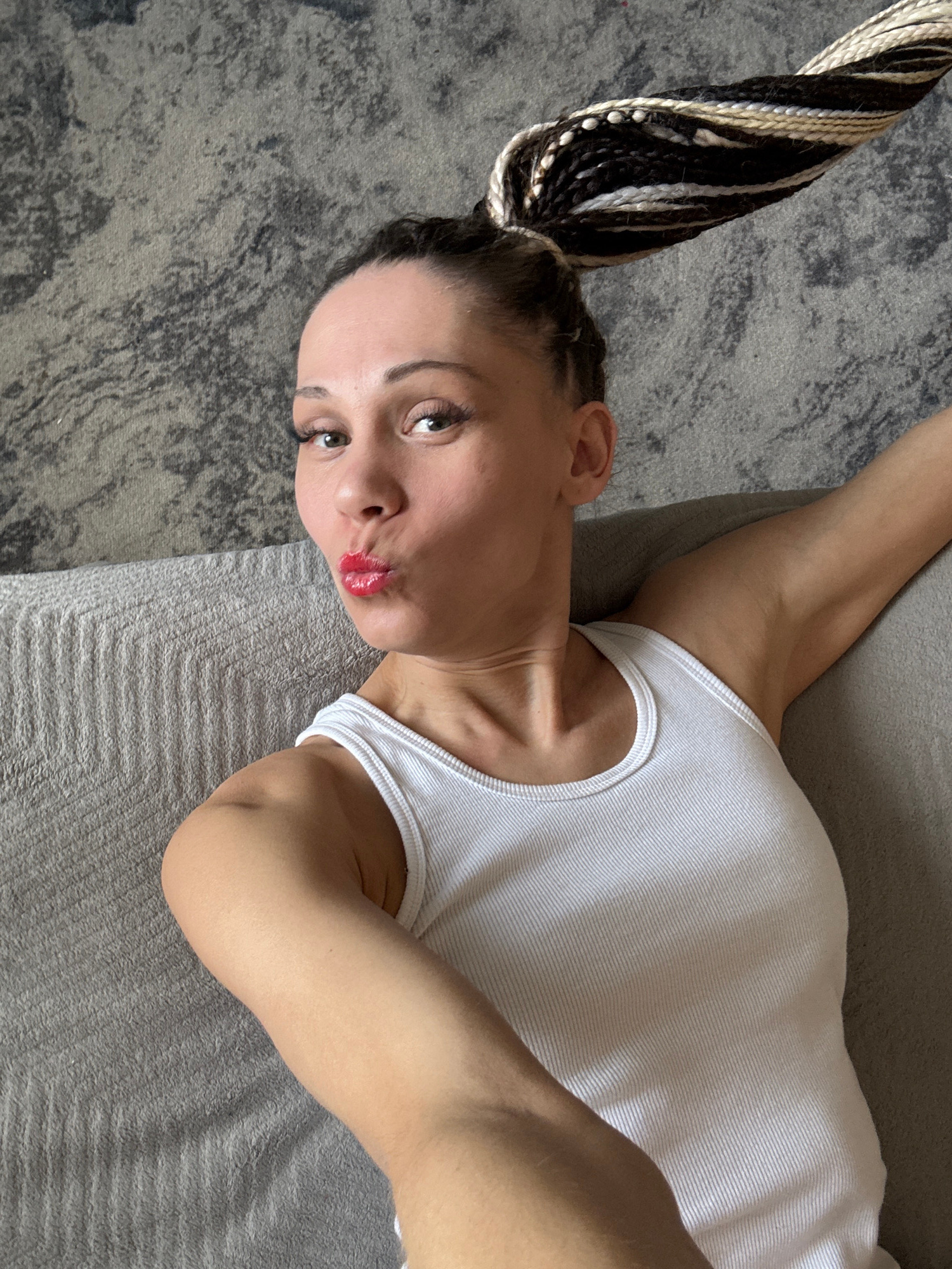A woman is lying on a gray upholstered surface. She is wearing a white tank top and has black, white, and blonde braids in her hair. Her face is turned towards the camera with her lips puckered. The l…read more
