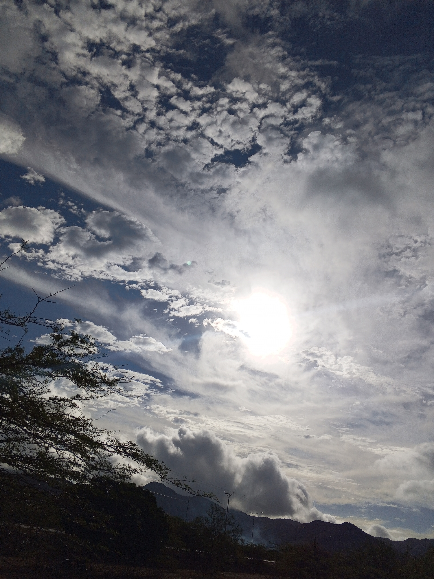 The image depicts a cloudy sky over a mountainous landscape, potentially in Altagracia, Venezuela. The sun is visible through a break in the clouds, creating a bright spot. The sky contains a mix of cā¦read more