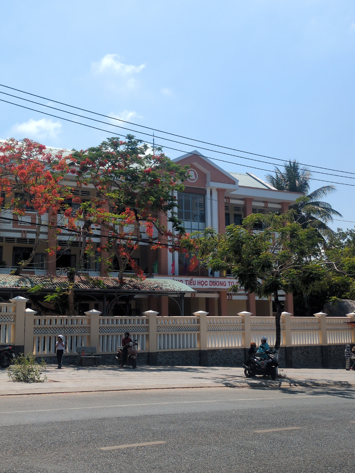 The image captures the facade of a building in Phú Quốc, Vietnam. The building is multiple stories, painted in shades of orange and white, and features windows. A large tree with red blossoms stands i…read more