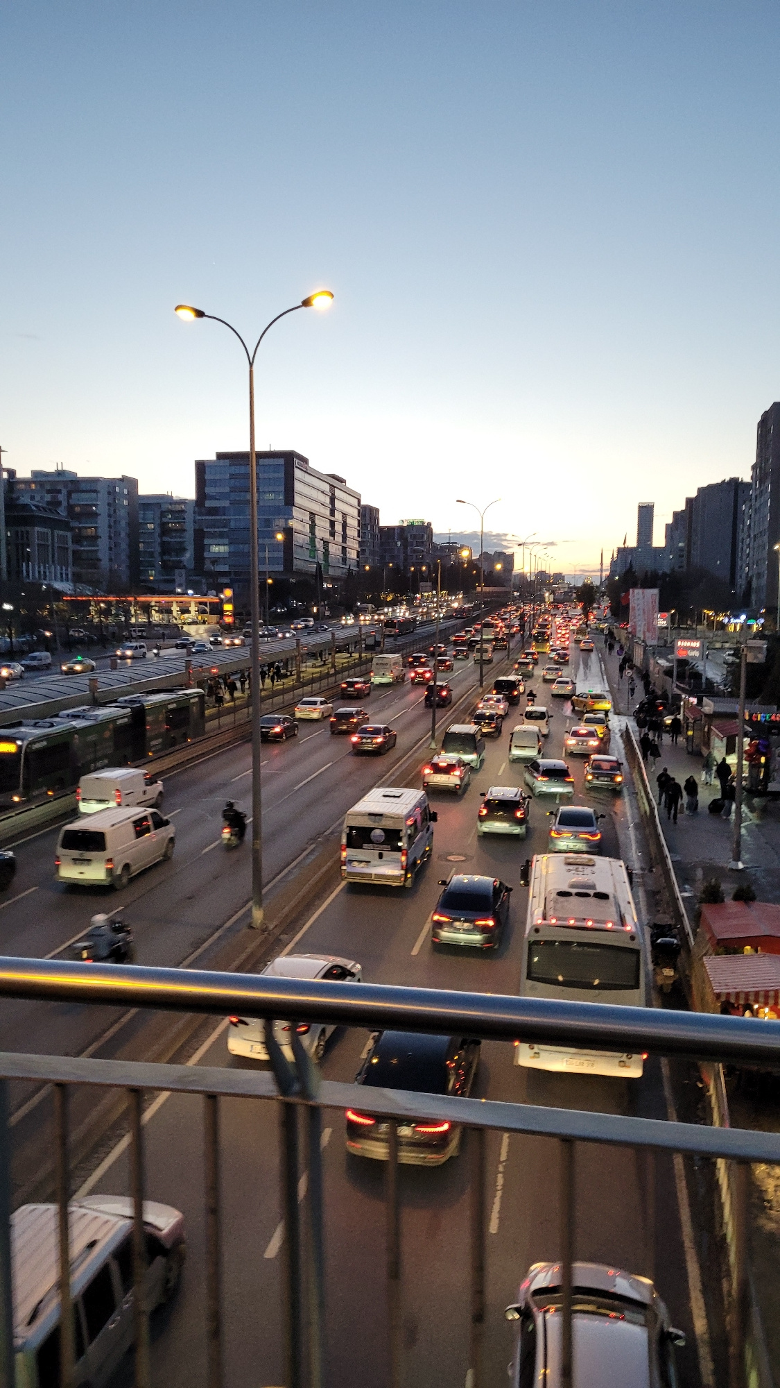 The image shows an elevated view of a busy highway in Esenyurt, Turkey, at dusk. The highway is congested with vehicles, mostly cars and vans, moving slowly in both directions. Buildings line the left…read more