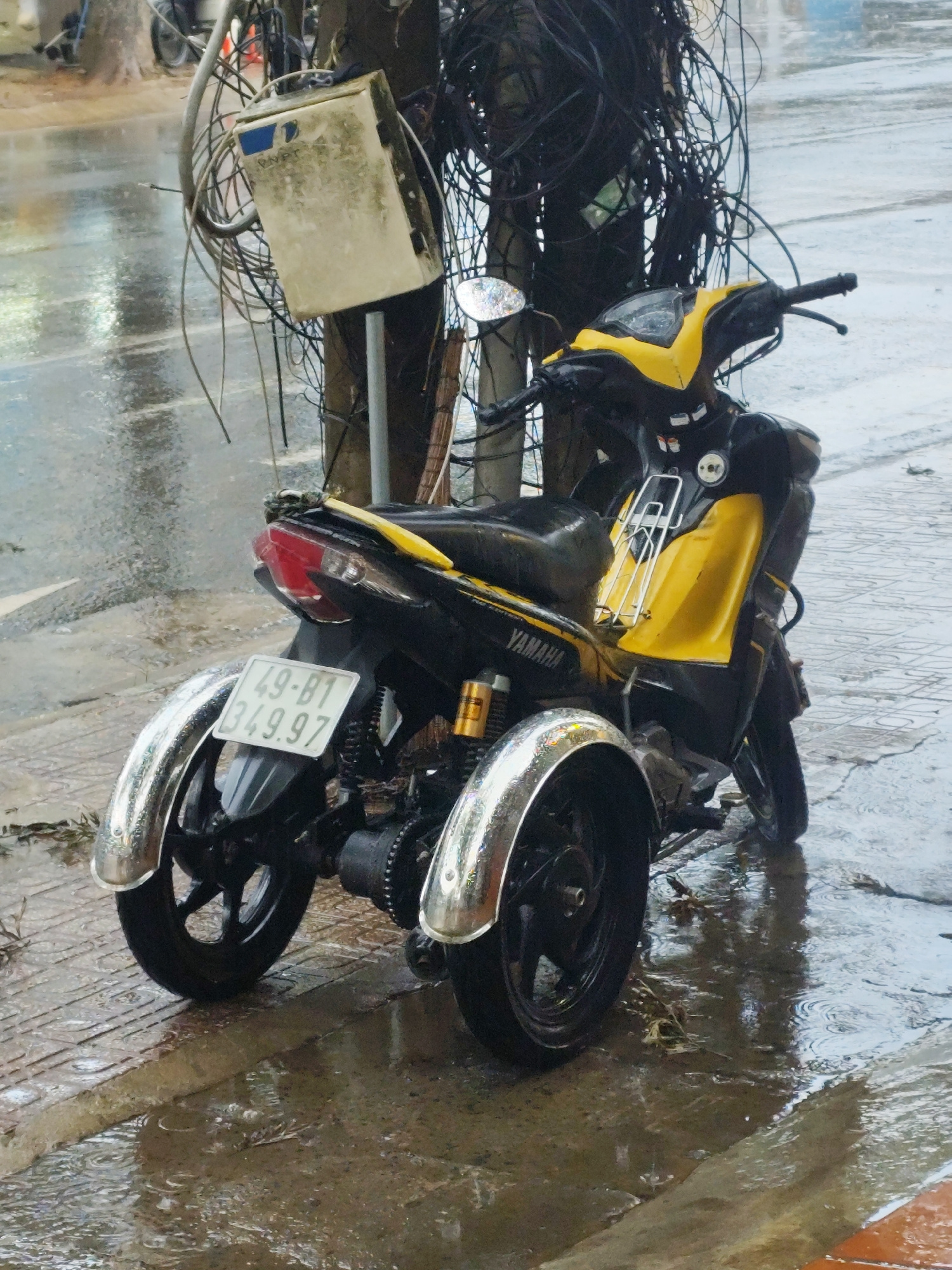 A yellow and black Yamaha scooter with three wheels is parked on a wet sidewalk next to a telephone pole with tangled wires in Lang Biang - Đà Lạt, Vietnam. The scooter's license plate reads "49-B1 34…read more
