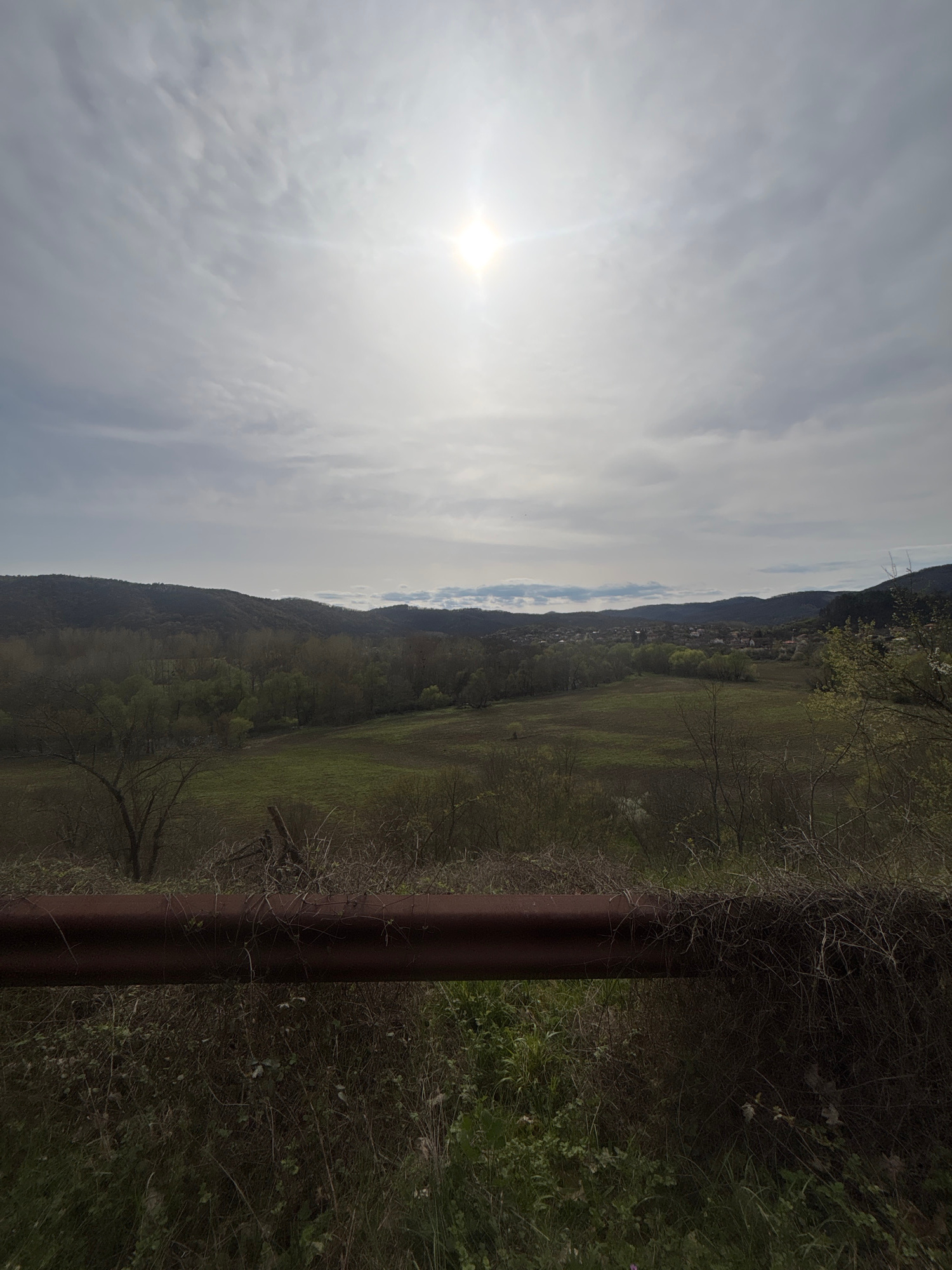 The image shows a landscape view in an outdoor setting. A bright sun is visible in the cloudy sky on the left side. A mountainous region extends from the left towards the center. A field area with gre…read more
