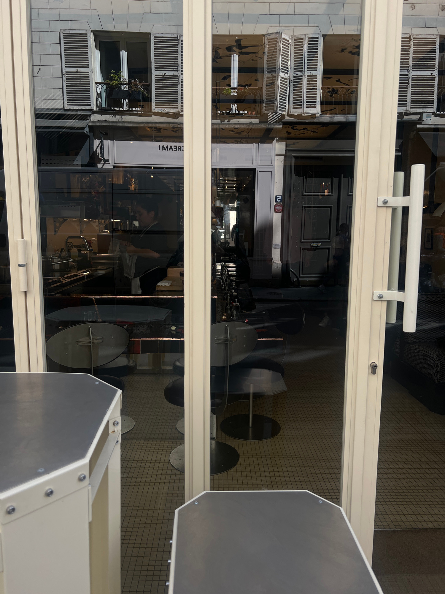 View through a white-framed glass storefront window in Paris, France. Reflected on the exterior is a multi-story building with white shutters. Inside the establishment, an individual wearing a black t…read more
