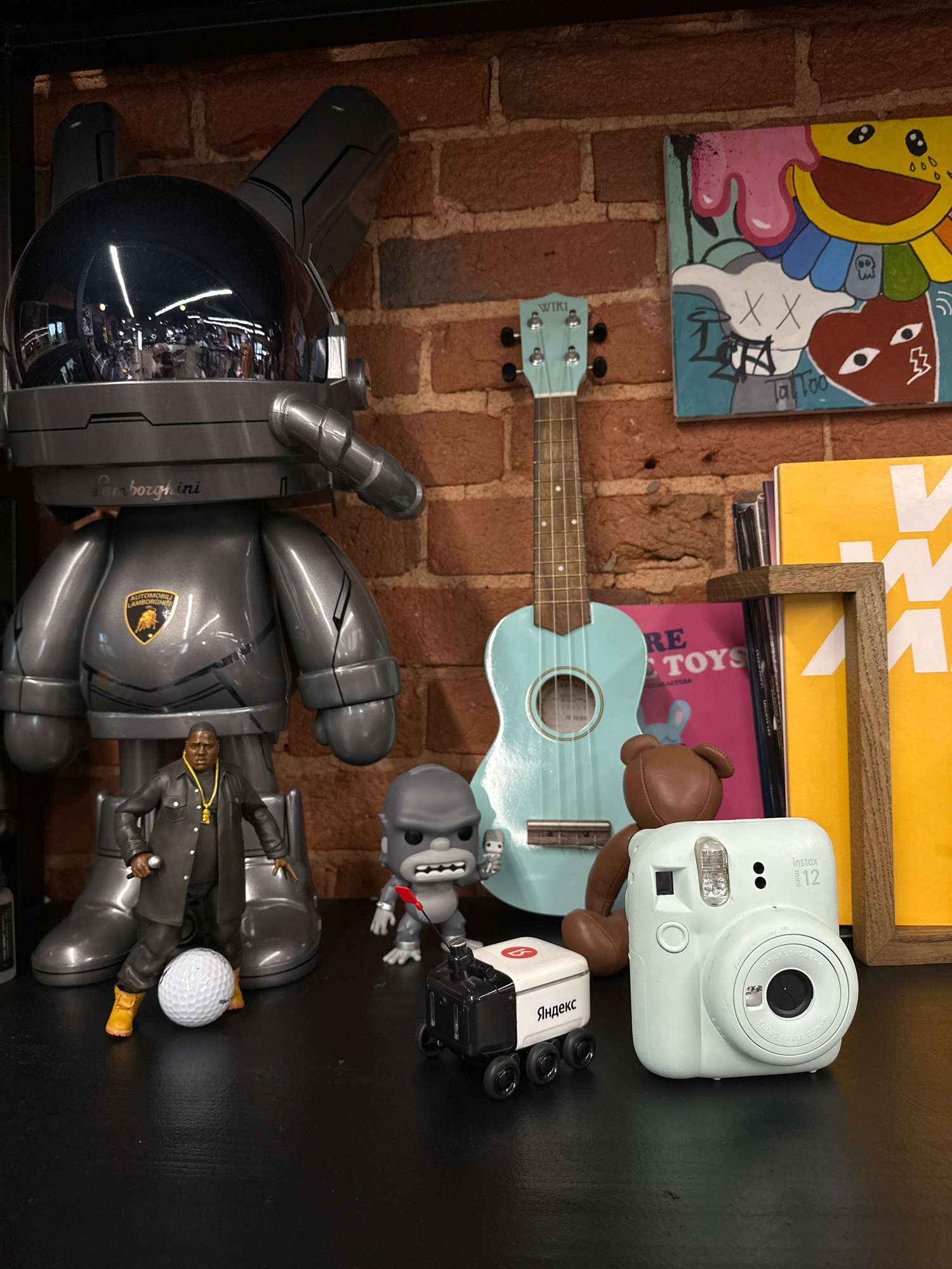 The image displays an eclectic arrangement of collectibles and decorative items, likely positioned on a shelf or tabletop against a warm brick wall backdrop. The collection blends pop culture, branded…read more