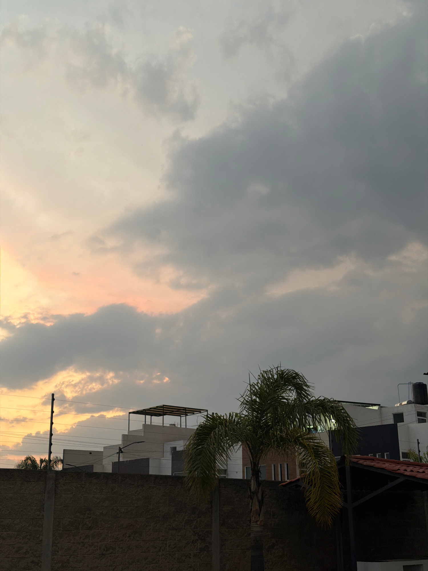 The image, taken in San Juan Cuautlancingo, Mexico, shows a sky filled with grey clouds, tinged with orange from the setting sun. A palm tree is visible against a building with a dark brick or stone w…read more