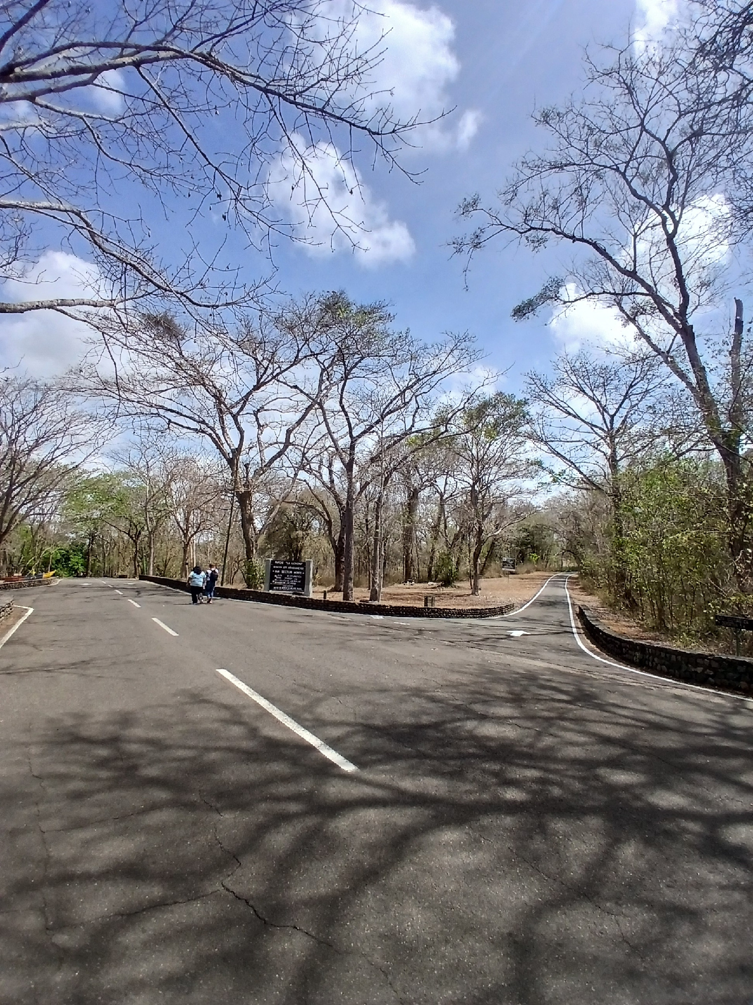 A slightly rotated outdoor shot features an asphalt road with a white line running along the left side, flanked by bare trees on the left, partially obscuring a blue sky with some clouds, and denser f…read more