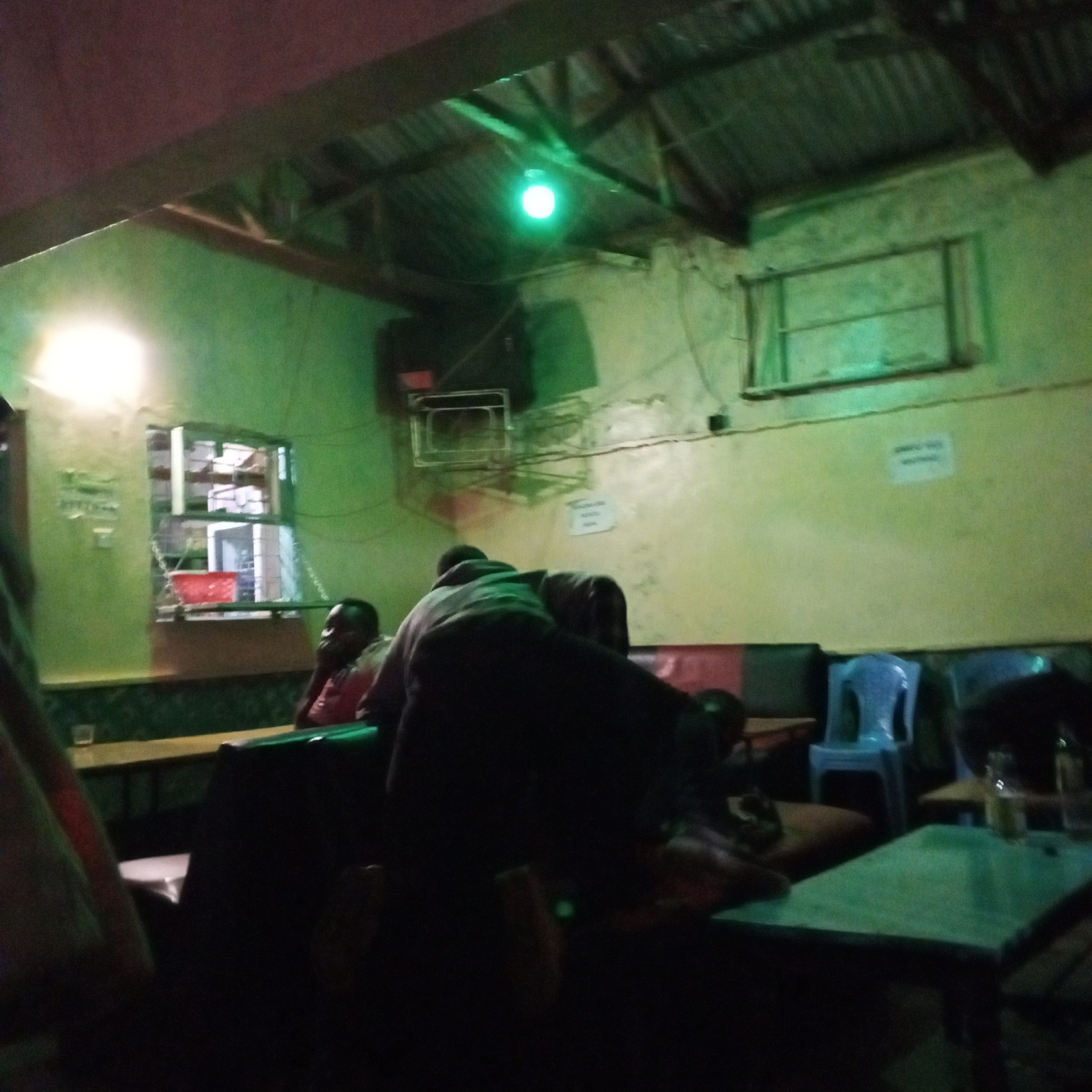 The image depicts the interior of a dimly lit establishment, possibly a bar or restaurant, in Borabu Chitago ward, Kenya. The walls are a faded greenish-yellow color, and the ceiling appears to be cor…read more