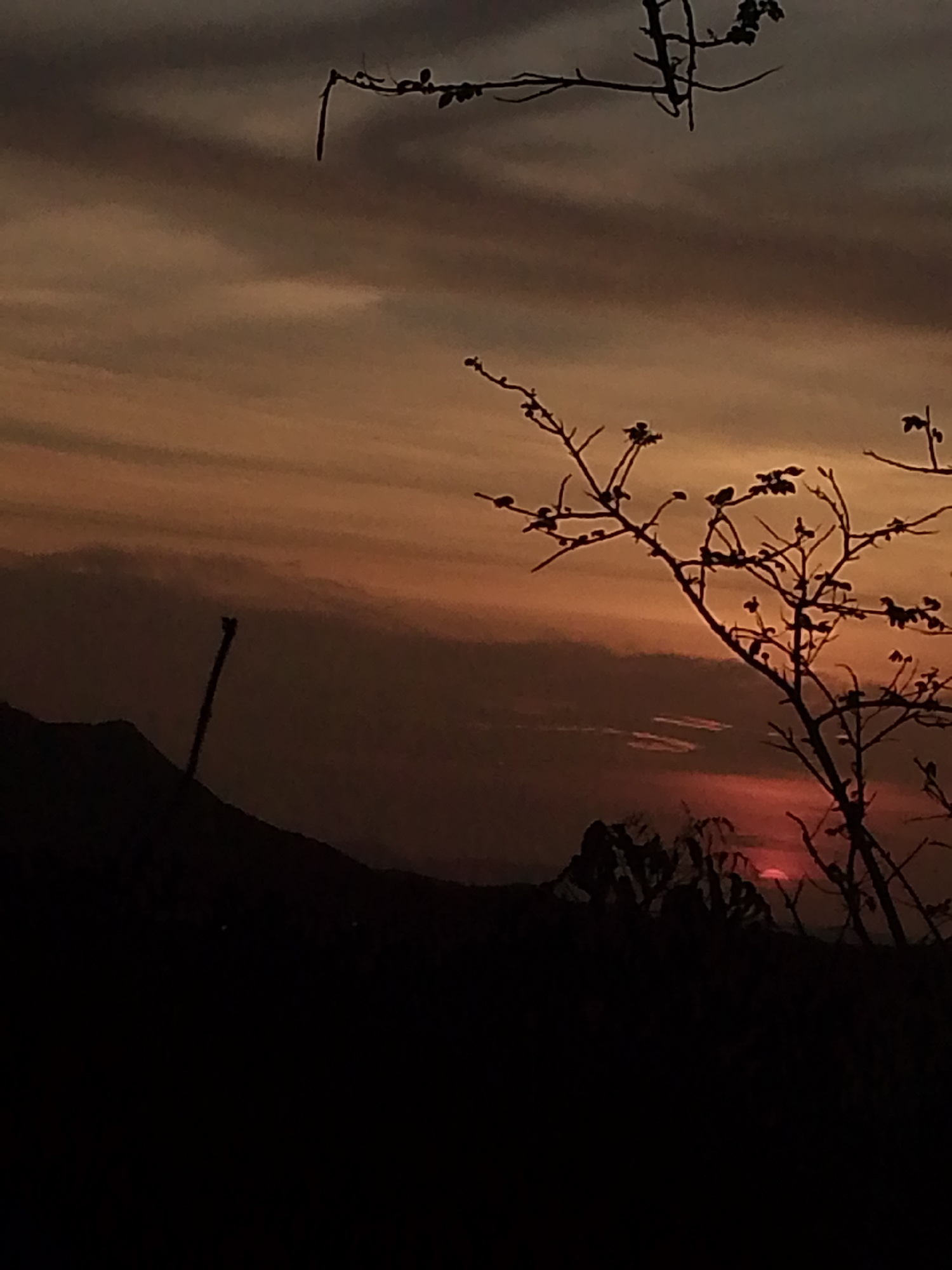 A low-angle photograph captures a twilight or sunset scene in Juan Griego, Venezuela. The scene features a silhouette of a small tree, with dark branches and budding leaves, against a backdrop of an o…read more