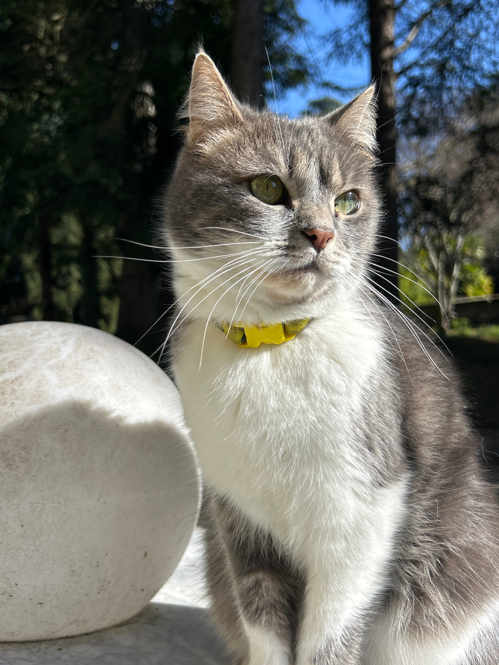 A domestic shorthair cat with grey tabby markings and white fur on its chest and belly is depicted sitting outdoors in Erba, Italy. The cat wears a yellow collar and is oriented facing slightly right…read more