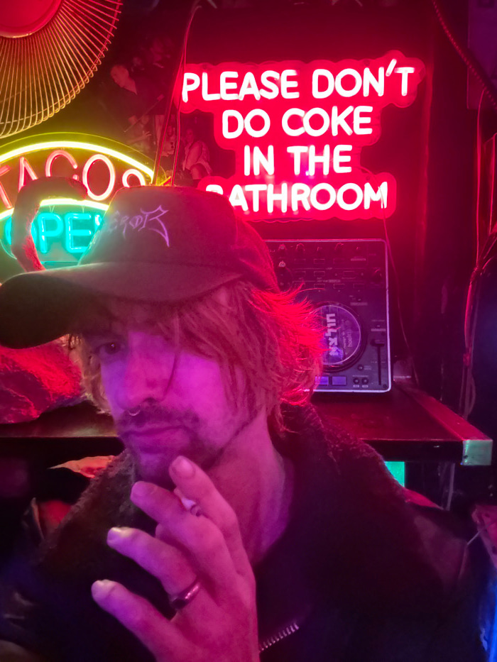 A red-haired person with a black cap and a white logo is angled to the left, holding a lit cigarette. Bright neon signs are present, including "PLEASE DON'T DO COKE IN THE BATHROOM" in red and "TACOSβ¦read more