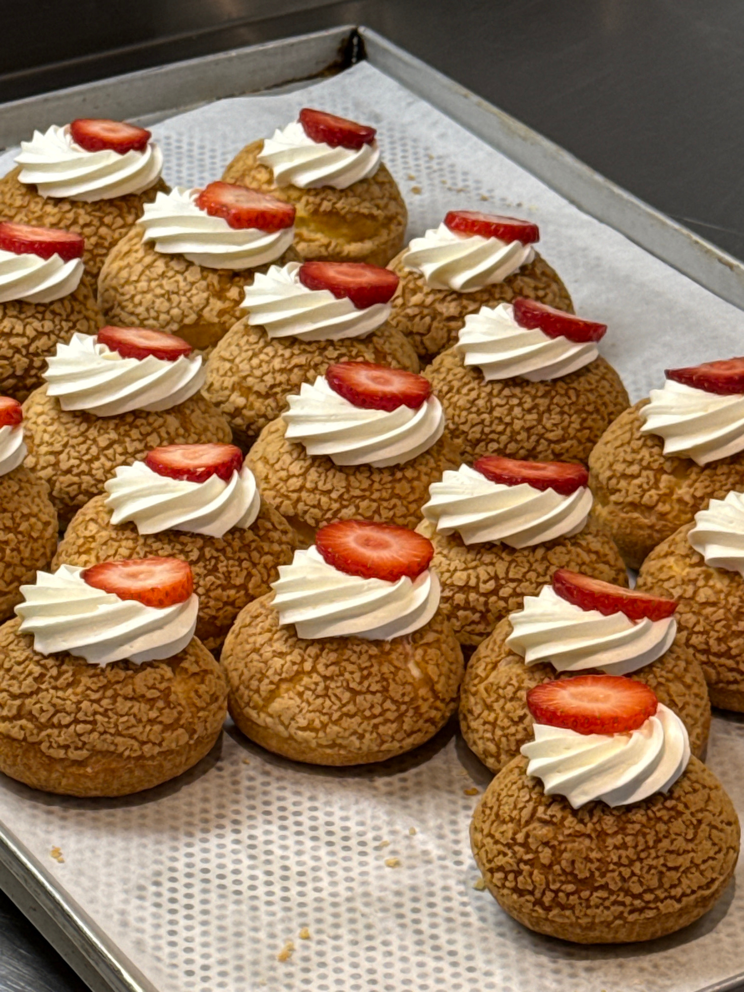 The image shows a tray of cream puffs topped with whipped cream and a slice of strawberry. The cream puffs have a cracked, golden-brown surface. The arrangement is on a metal tray lined with white par…read more
