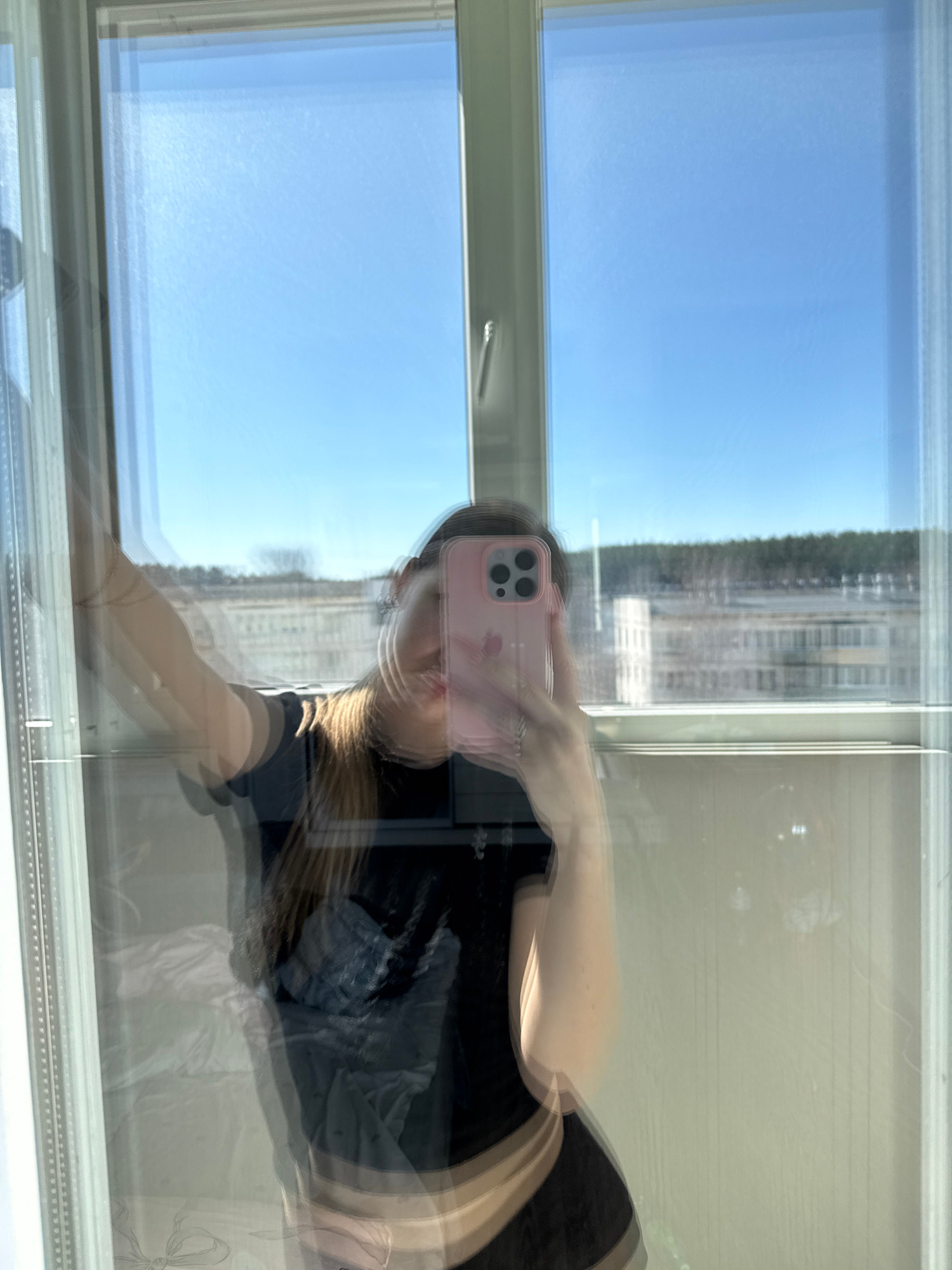 A reflection in a window shows a person holding a pink iPhone, a view of a cityscape, and part of the interior. The background landscape, visible through the window, appears to be a skyline including…read more