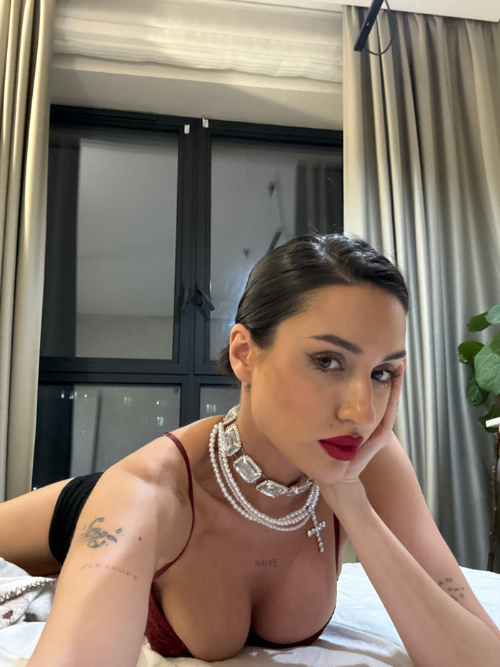 The image displays a female subject positioned prone on a white bedspread in an indoor setting, identified as Khimki, Russia. The subject is propped on her right forearm, with her left hand resting ag…read more