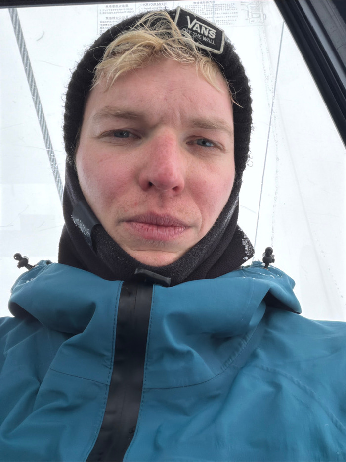 A selfie shows a fair-skinned person wearing a black Vans beanie and a blue winter jacket with a black stripe across the chest. They are also wearing a black neck warmer. The person has light blonde h…read more
