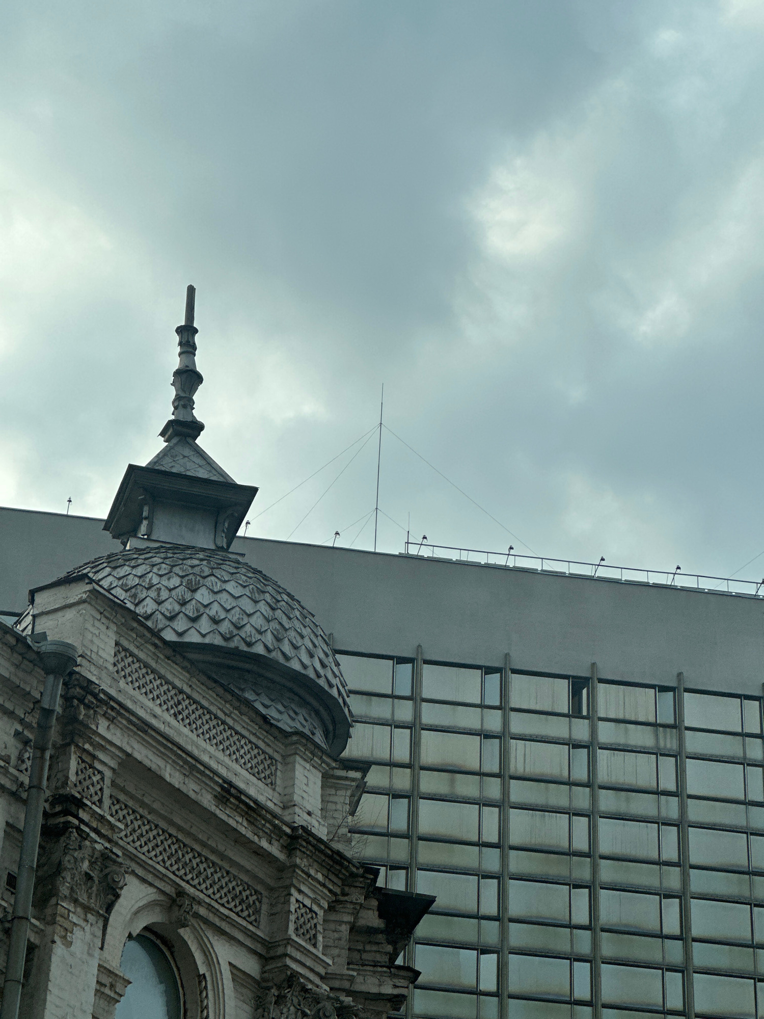 The image shows a cloudy sky above two buildings in Kyiv, Ukraine. On the right, the top of a historic building with a patterned dome and ornate detailing is visible. To the left of the historic build…read more