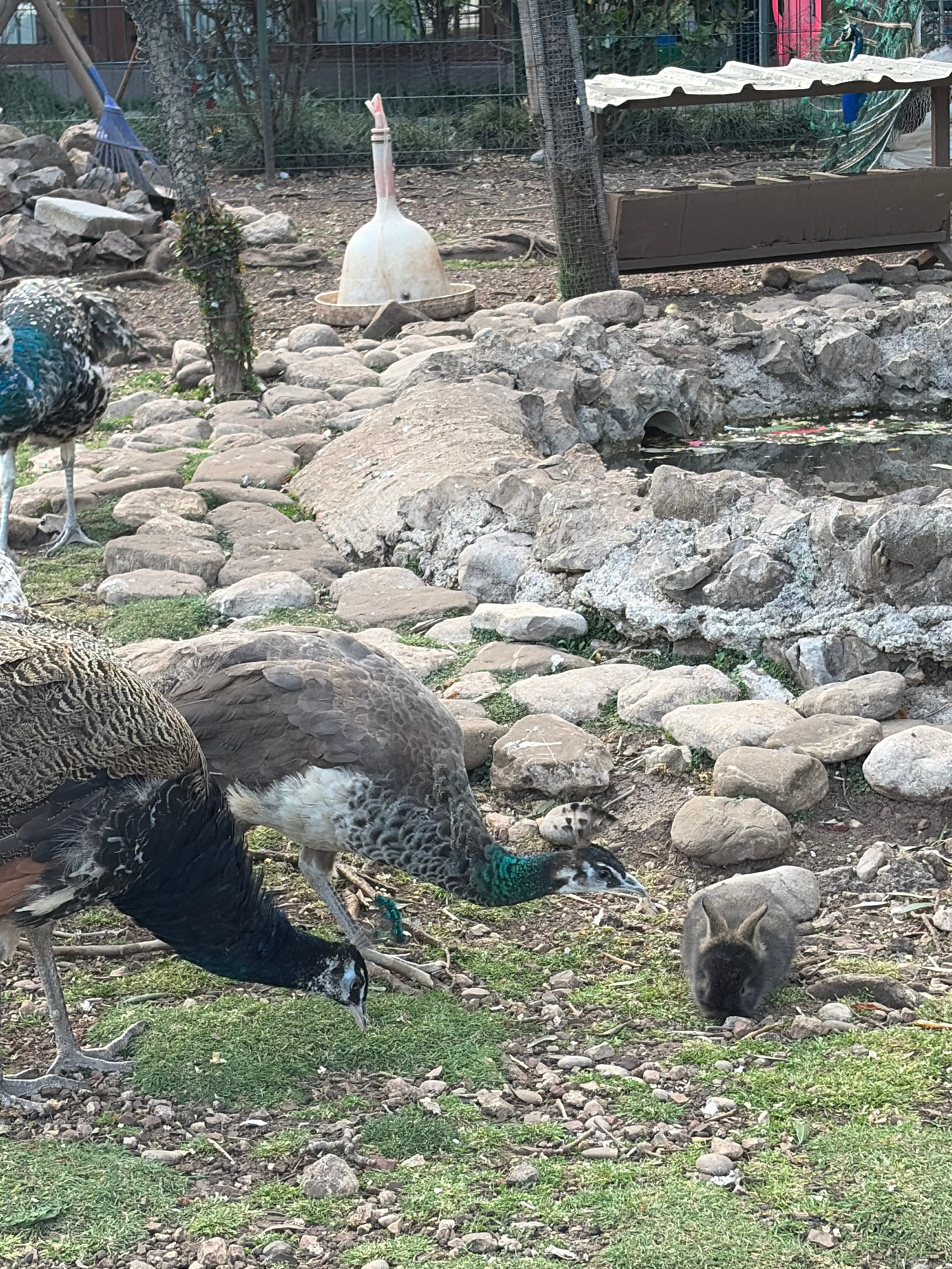 The image shows a group of peacocks in what appears to be a zoo or park-like setting in Budva, Montenegro. There are at least three peacocks visible, including an all-black variety. The animals are po…read more