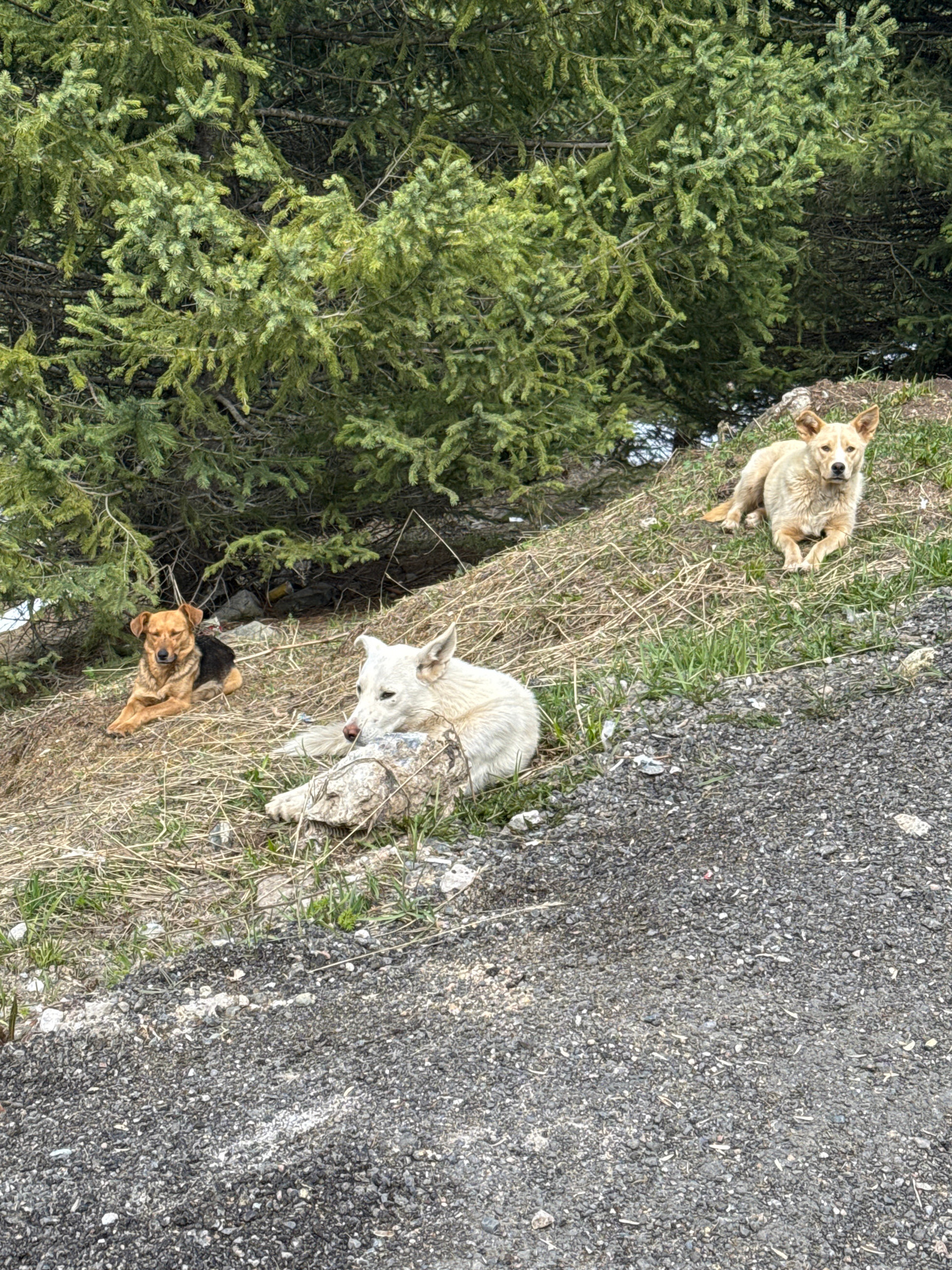 This media file captures a daylight scene in what appears to be a natural or semi-wild environment, possibly near Almaty, Kazakhstan, given the context. The image features three dogs positioned on a gā¦read more