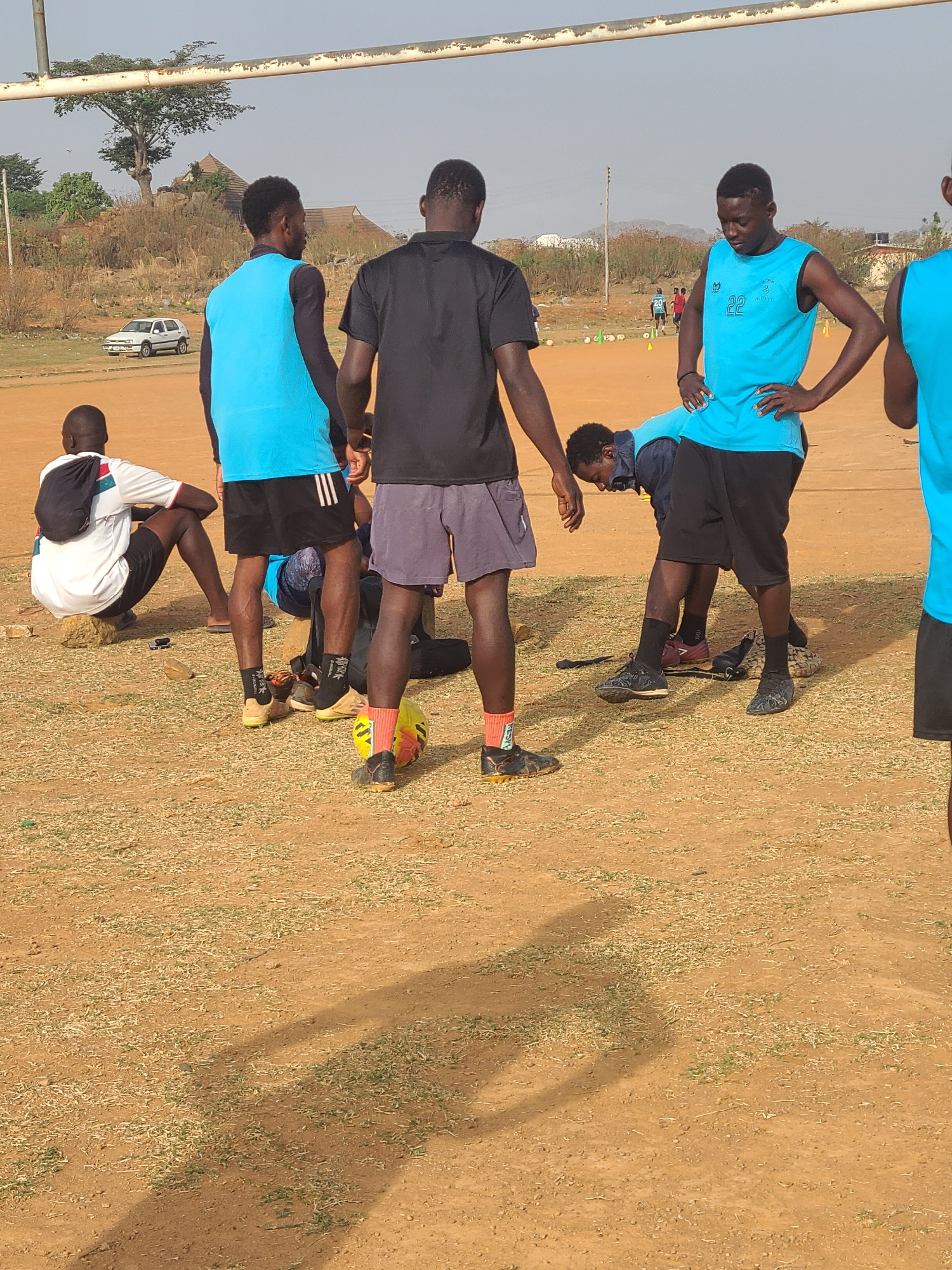 Several people stand on a dirt field in Barikin Jirga Summa, Nigeria. Some individuals wear blue athletic shirts and black shorts, while others wear black shirts and grey shorts. One person wears a wh…read more