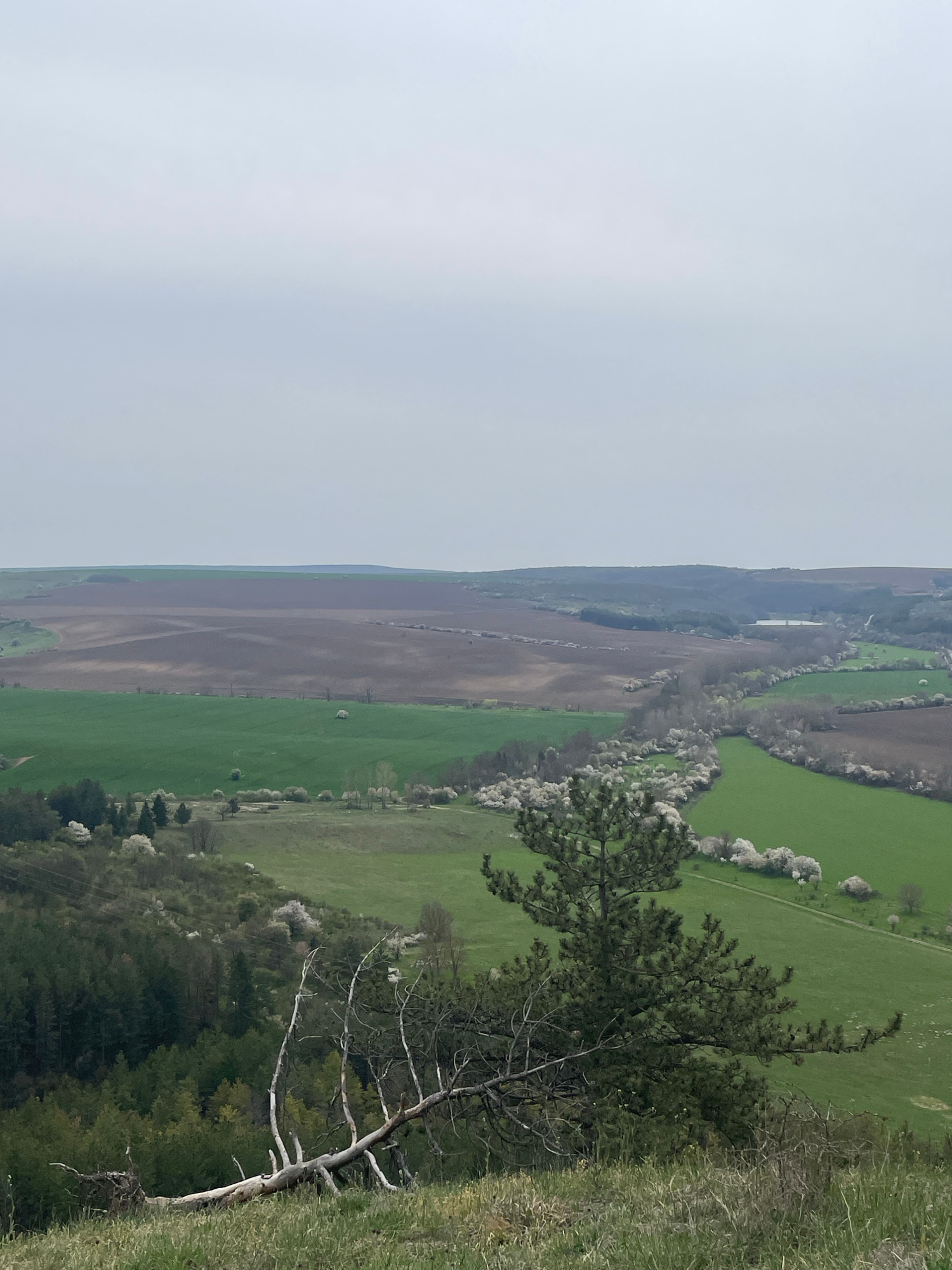 The image shows a landscape in Razgrad, Bulgaria, with a clear division between the sky on the left and the terrain on the right. The terrain is divided into agricultural fields of different colors. A…read more